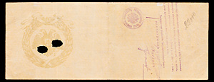 Всевеликое Войско Донское, г. Таганрог. 5 % Краткосрочное Обязательство 5000 рублей 1919 года, серия АД, № 00065. С оттиском штампа Таганрогского отделения ГБ, срок 1 апреля. Сохранность очень хорошая, два отверстия гашения. Кардаков# VI.2.9а (R). Рябченко# 5310а (Р). Очень редкое.