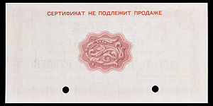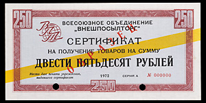 Всесоюзное Объединение «ВНЕШПОСЫЛТОРГ». Сертификат 250 рублей 1972 года, серия А, № 000000. «Образец», с желтой полосой. Сохранность почти отличная, внизу два отверстия гашения. Истомин, Трик# 1.2.50 (без оценки!). Данный номинал выпуска известен только в виде «Образца»! Очень редкий.