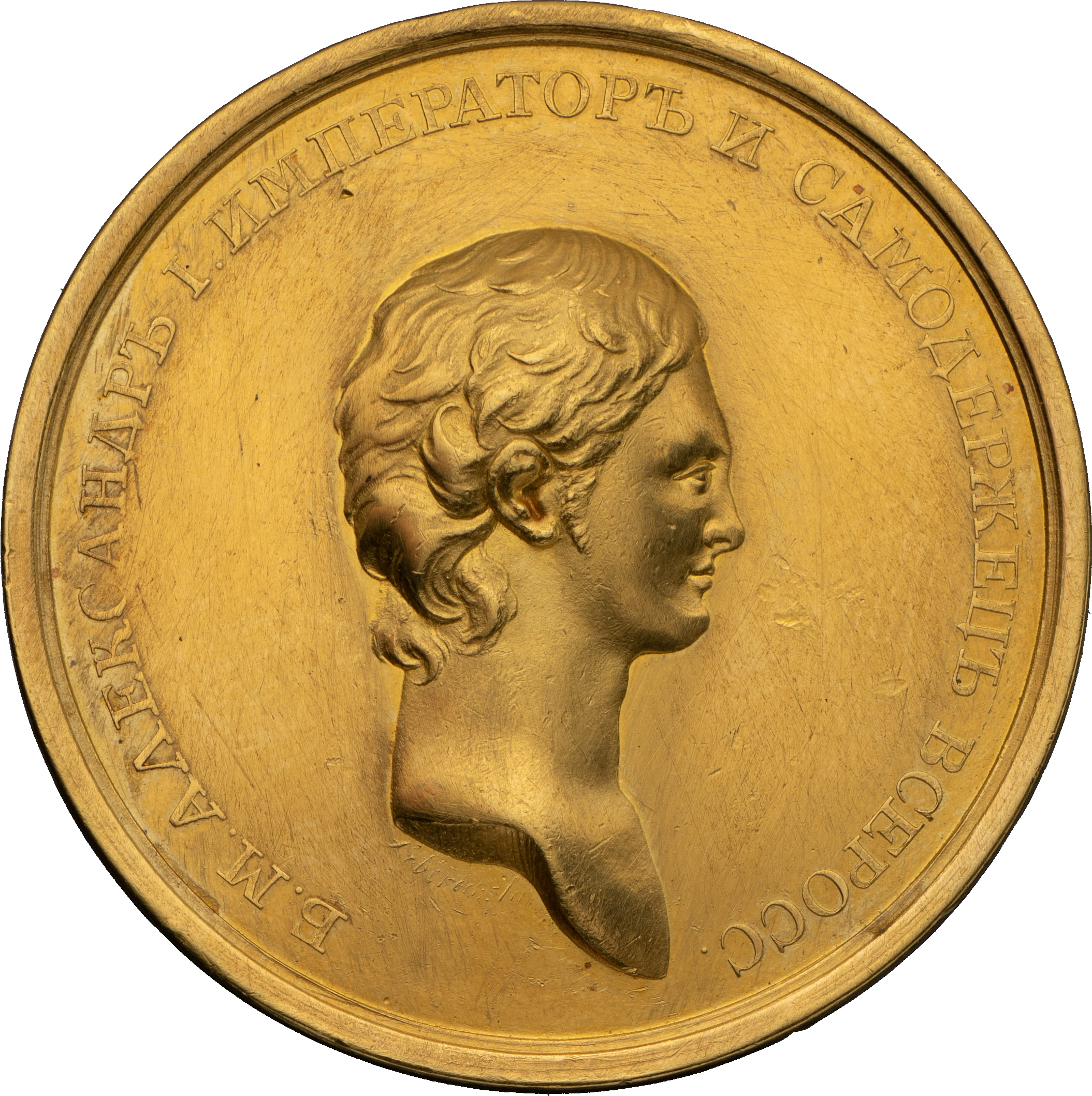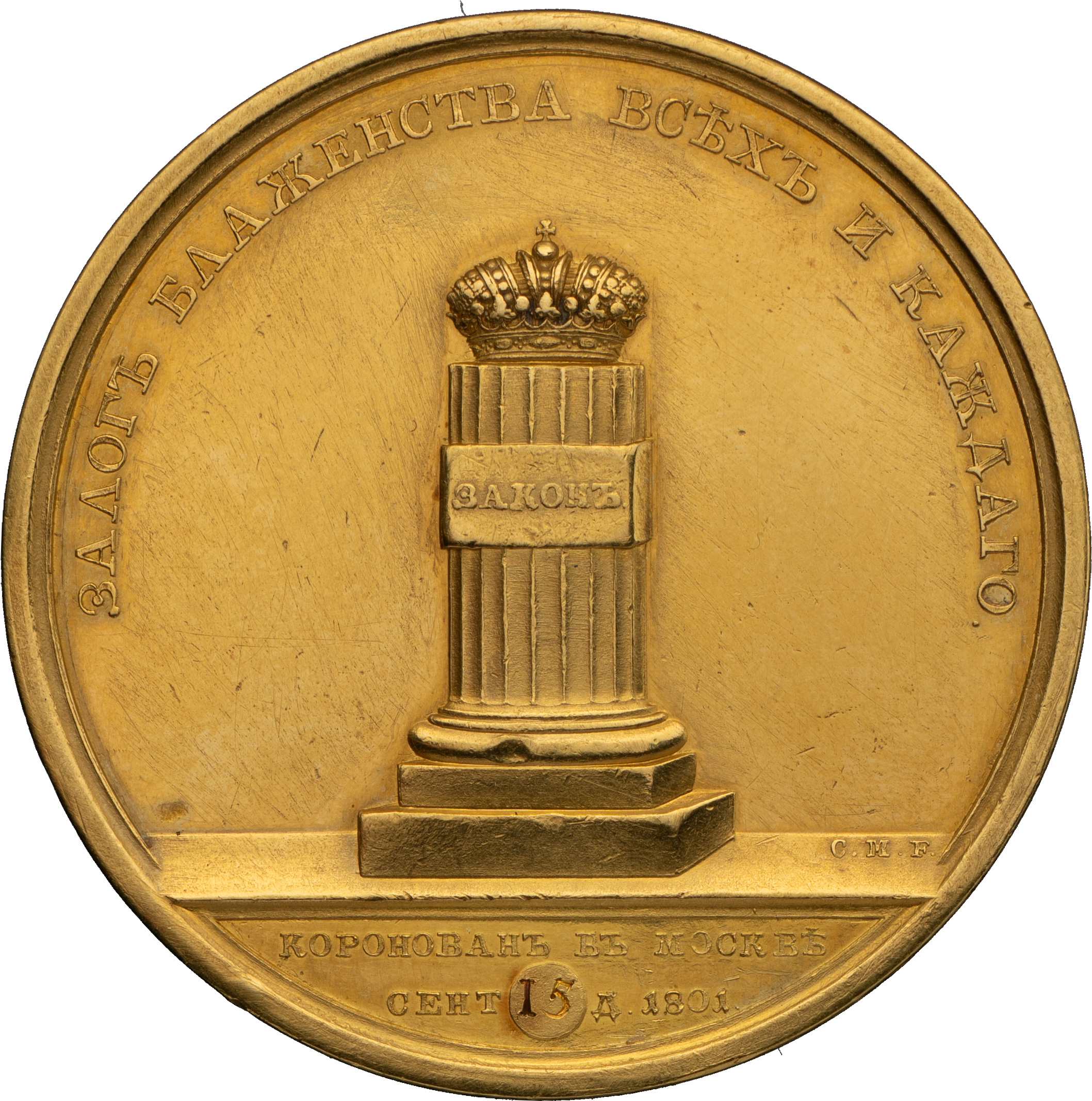 Медаль в память коронования императора Александра I, 15 сентября 1801 г. СПб монетный двор, 1801 г. Медальеры: лиц. ст. — К.А. фон Леберехт (внизу на поле: C.LEBERECHT. F.), об. ст. — К.И. Мейснер (справа внизу: C.M.F.). Золото; 34,52 г. Диаметр 41,6 мм. Смирнов# 332/в. Дьяков# 264.7 (R2 в серебре). Сохранность очень хорошая. Очень редкая.