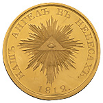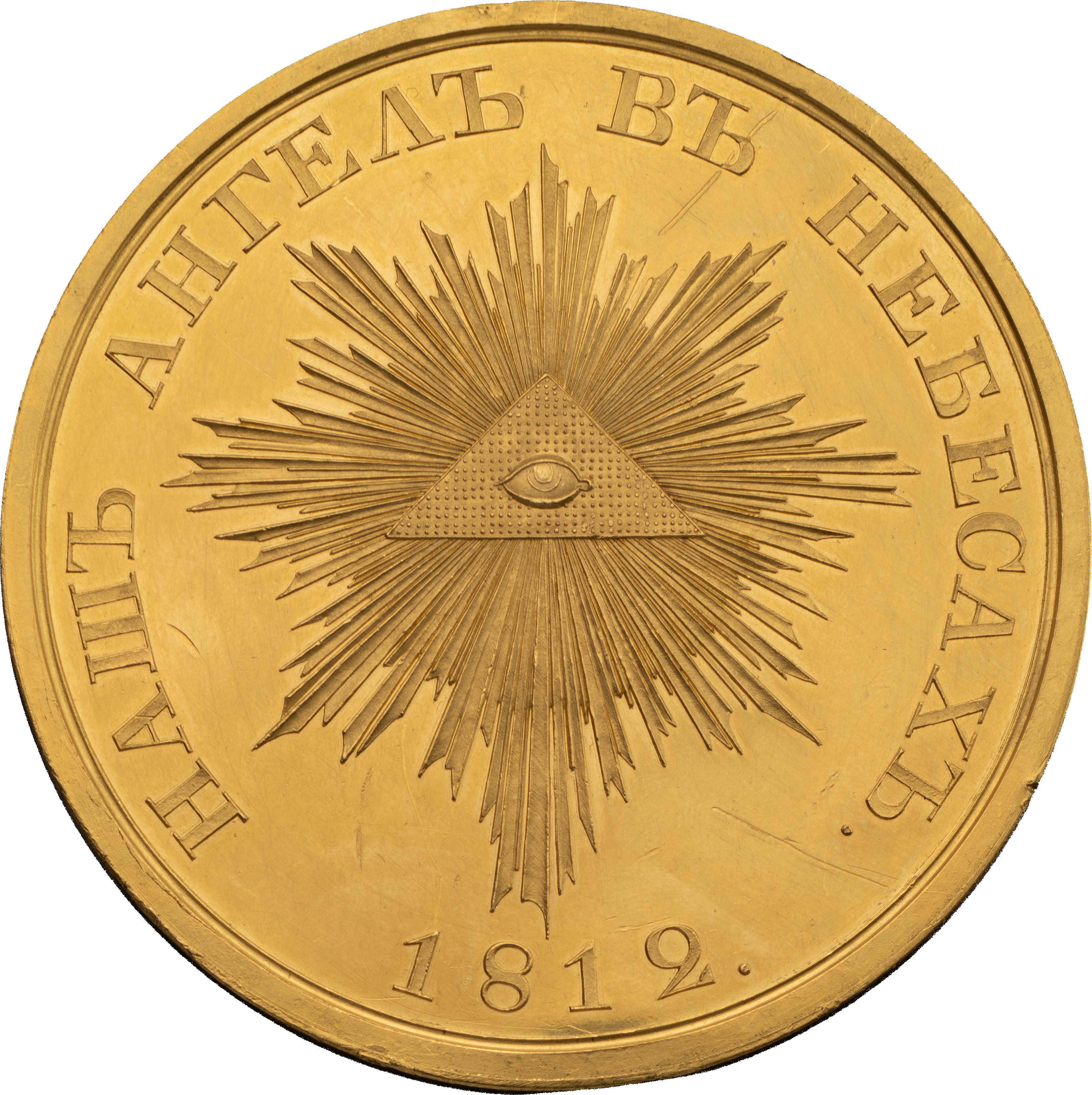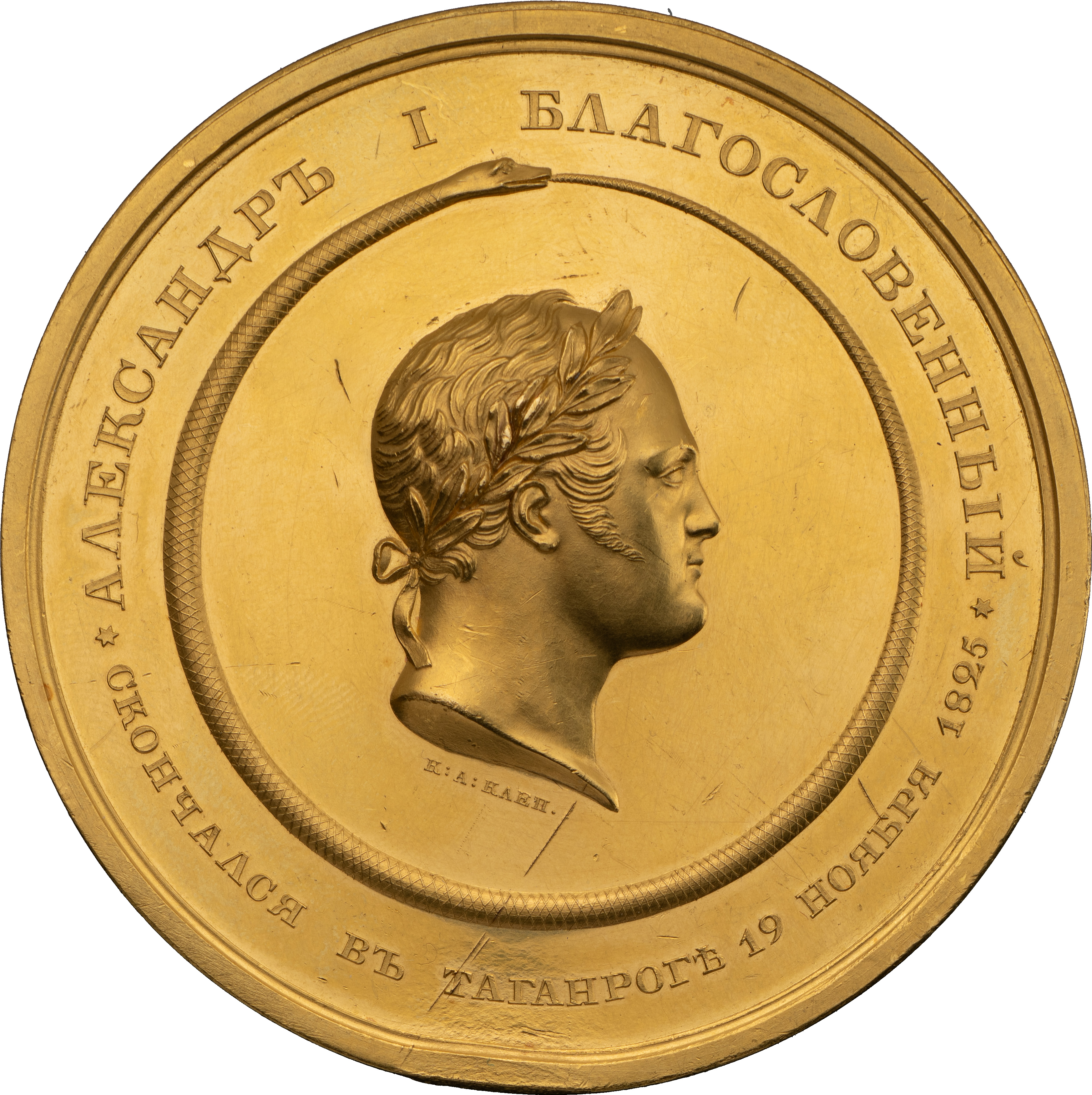 Медаль в память кончины императора Александра I, 19 ноября 1825 г. СПб монетный двор. Медальер лиц. ст. А.А. Клепиков (под обрезом изображения: К:А:КЛЕП.), копия штемпеля графа Ф.П. Толстого. Золото; 169,97 г. Диаметр 68,6 мм. СРМ# 341. Дьяков# 429.2 (R4). Аналог см. Смирнов# 412. Сохранность почти отличная, на гурте — след от удара и несколько мелких запилов для опробования. Редкая.