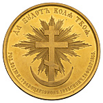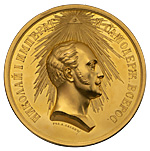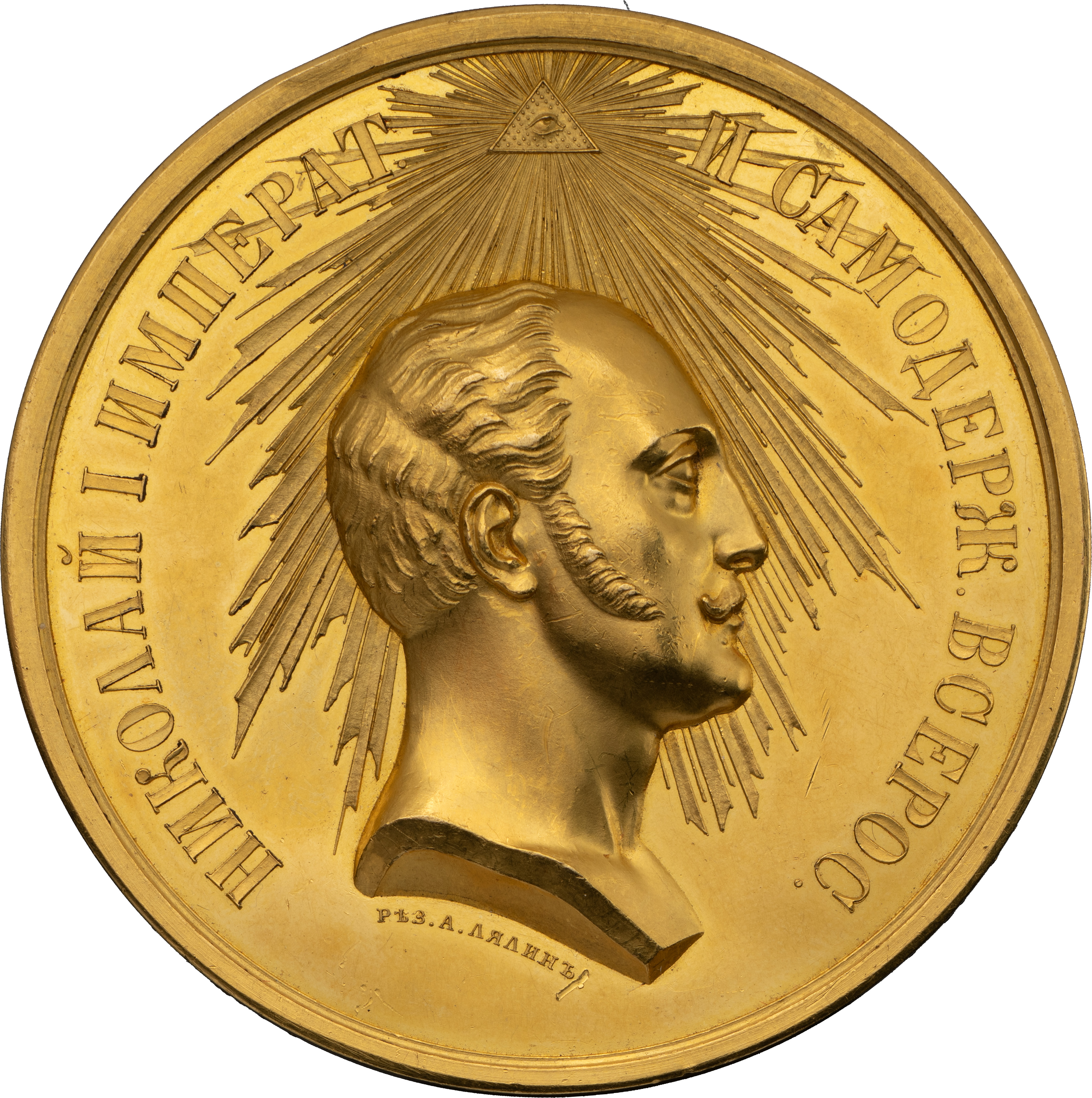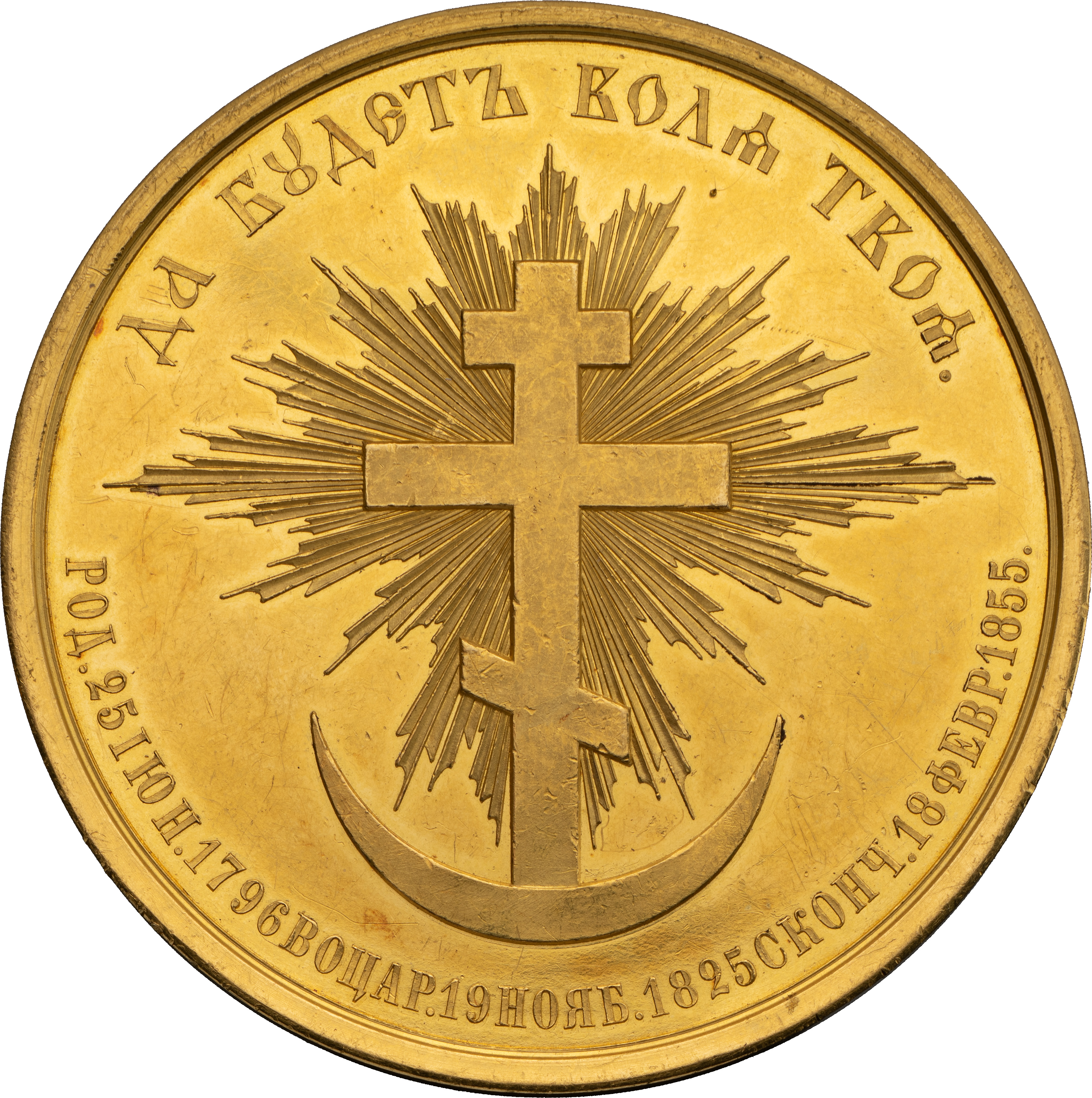Медаль в память кончины императора Николая I, 18 февраля 1855 г. СПб монетный двор. Медальер А.П. Лялин (лиц. ст. — под обрезом изображения: РѢЗ.А.ЛЯЛИНЪ.). Золото; 203,95 г. Диаметр 68,3 мм. Смирнов# 557. Дьяков# 613.1 (R4). Сохранность почти отличная, на гурте — след легкого удара. Очень редкая.