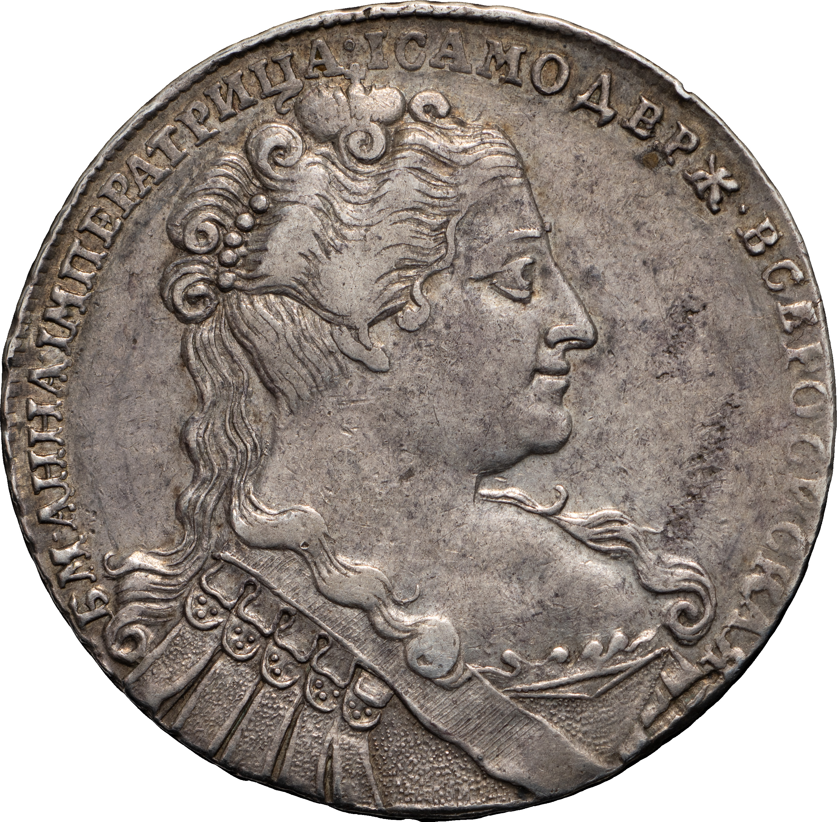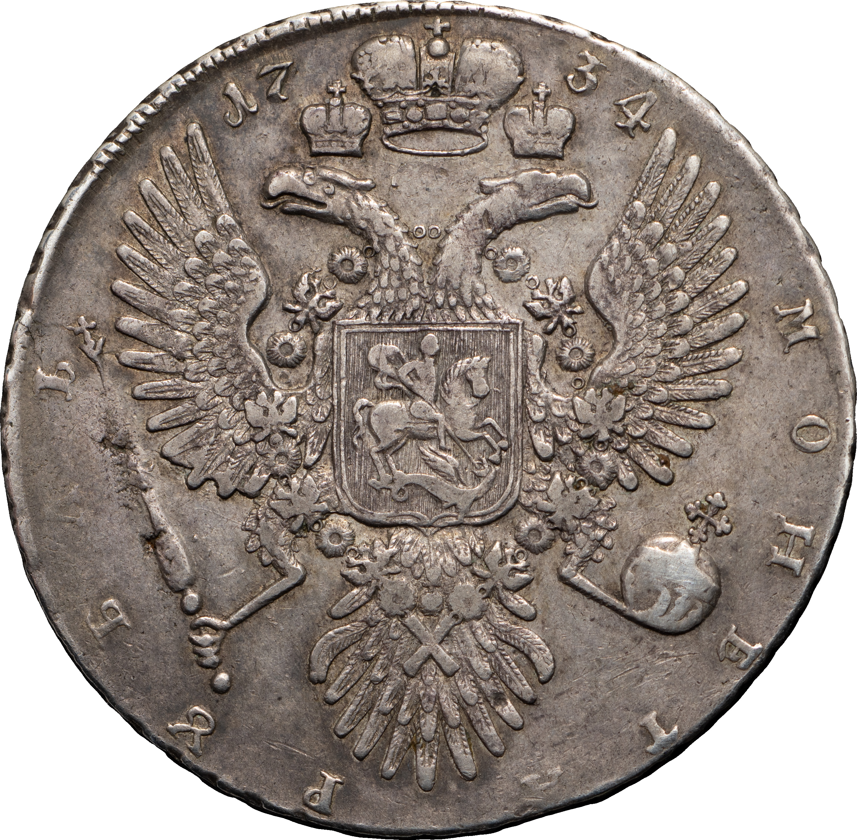1 рубль 1734 года. Лиц. ст.: «Лирический» портрет, крест короны разделяет легенду. Об. ст.: корона разделяет дату, орёл особого рисунка. Серебро, 24,79 г. Сохранность почти отличная, небольшой дефект заготовки, легкая патина. ГМ# 7.9 (редкая). Severin# 1174 (черта с точкой). Уздеников# 0716 (черта). Дьяков# 18. Биткин# 98 (R3). Полуйко# 31 (!!!). Крайне редкий, 25 рублей по Ильину. Интересная и редкая разновидность рисунка портрета, одновременно со специфическим, крайне редким, типом реверса — данное сочетание особо отмечено и выделено в классической нумизматической литературе.