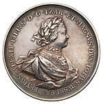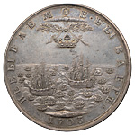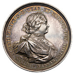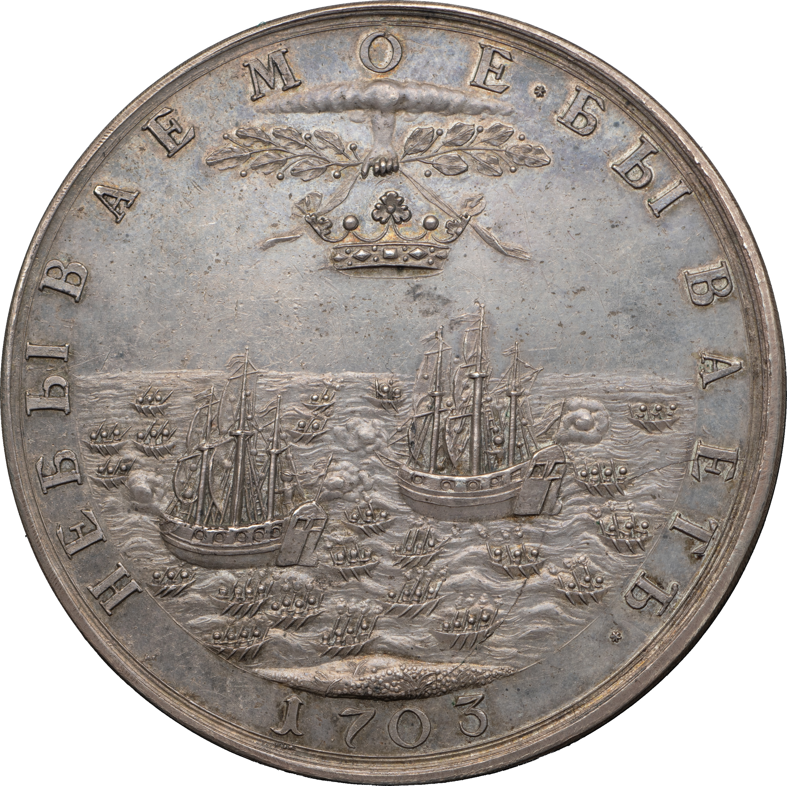 Наградная медаль за взятие двух шведских судов в устье Невы, 7 мая 1703 г., оттиск в серебре, СПб монетный двор. Без подписи медальера. Серебро; 76,93 г. Диаметр 55,1 мм. Иверсен# XV.1.d. Соколов# 054.д.К (R2). Биткин (медали)# К144 (R3). Дьяков# 16.6 (R2). Аналоги см. Смирнов# 167. Великие Русские победы в медали и гравюре# # 226–227. Сохранность отличная. Очень редкая.