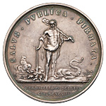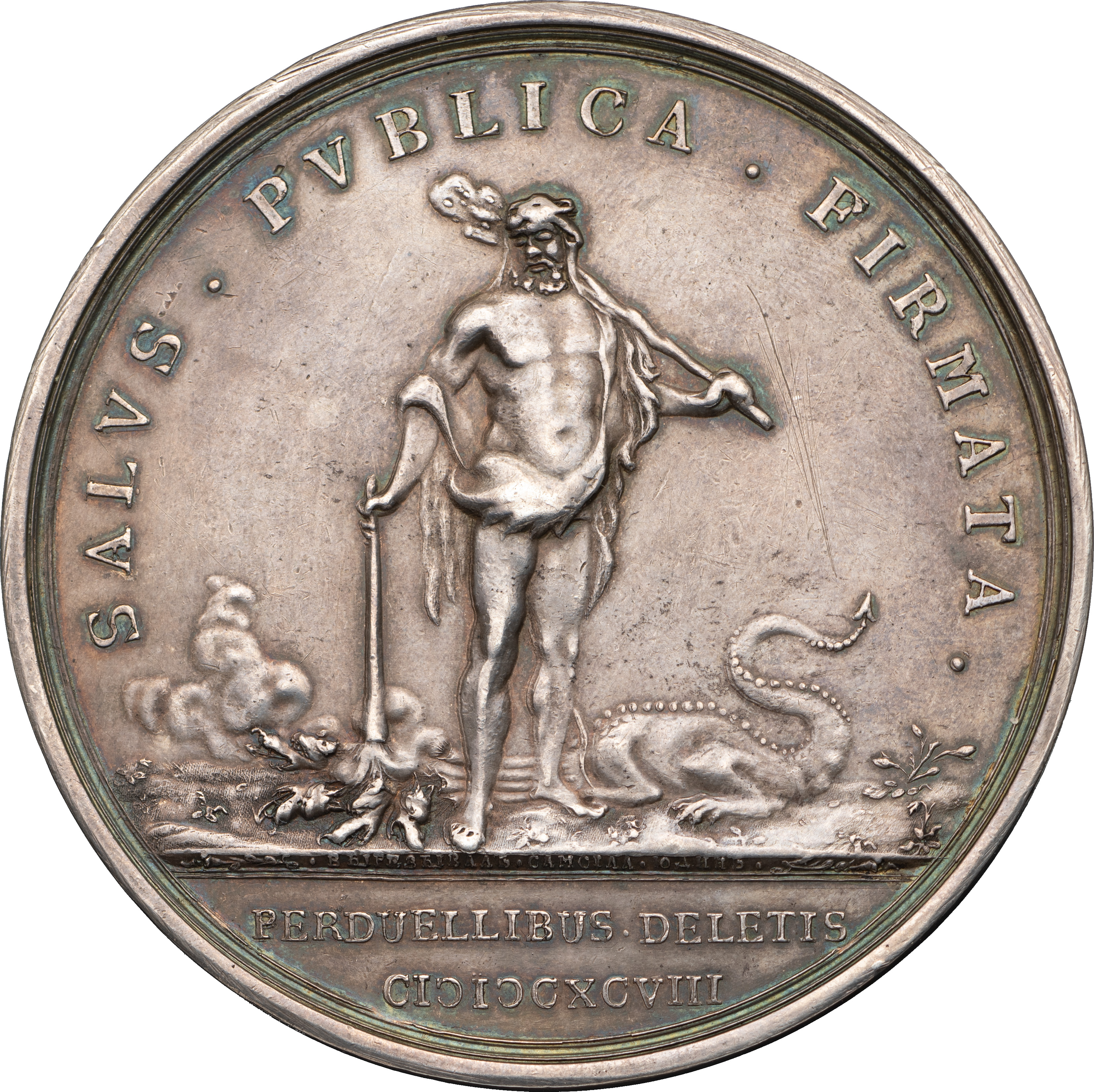 Надписи на об. ст. медали: по окружности — «SALVS . PVBLICA . FIRMATA .» (Общественное благополучие утверждено…), под обрезом изображения в 2 строки — «PERDUELLIBUS•DELETIS / CIƆIƆCXCVIII» (… после того, как враги были уничтожены, 1698).