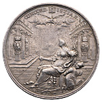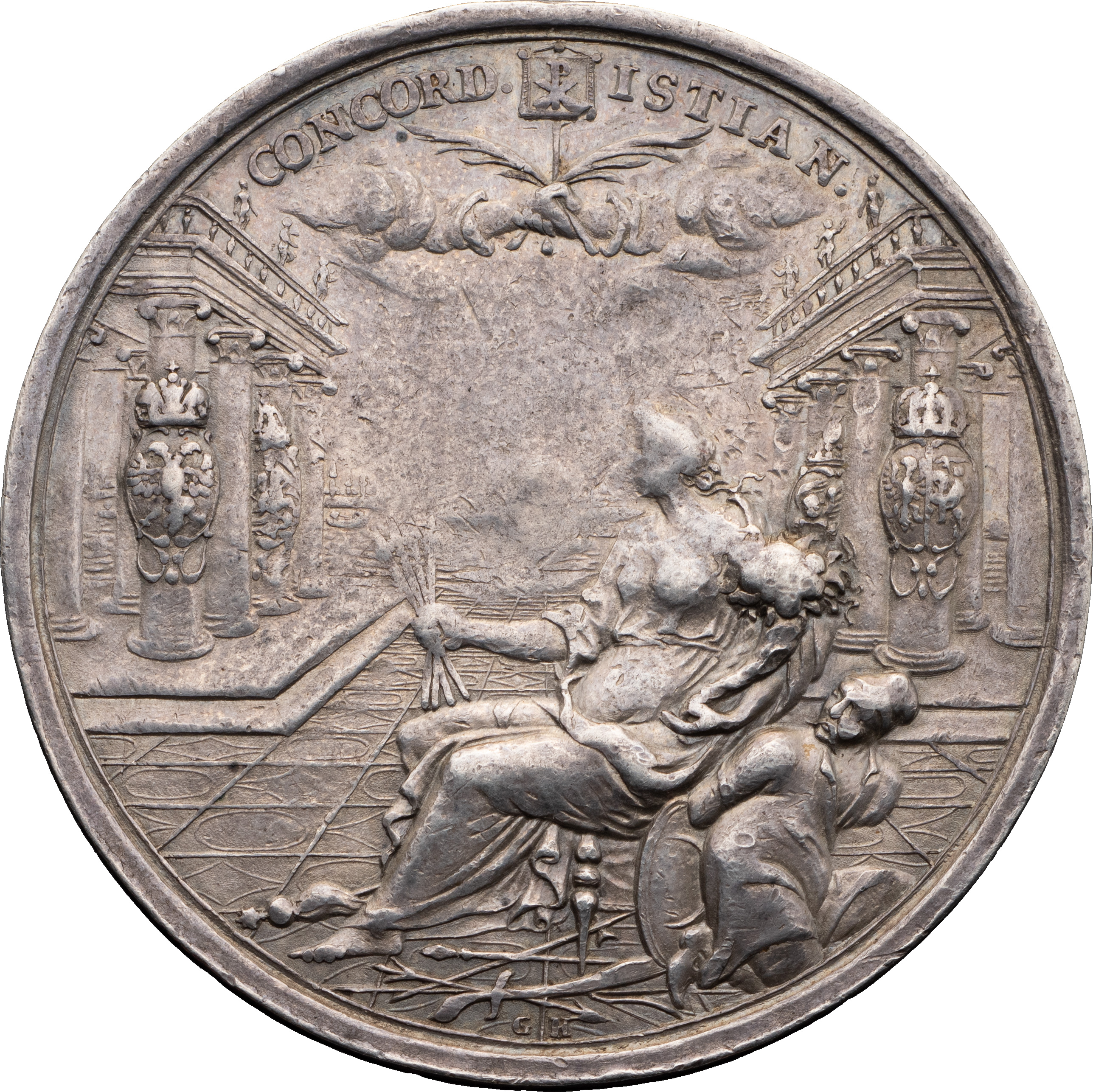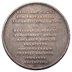 «В 1686 г. состоялось вступление России в “Священную лигуˮ. Исполненная на это событие медаль типична для своего времени. Согласие олицетворяет сидящая на берегу моря перед пропилеями женская фигура с пучком стрел в руках. Вступившие в лигу государства — Австрия, Россия, Польша и Венеция — представлены четырьмя гербами, прикрепленными к колоннам. Надпись: CONCORD. CHRISTIAN, (христианский союз), монограмма Христа на спускающейся с небес хоругви и связанный турок у ног Согласия демонстрируют высокие побуждения сторон. Двенадцатистрочная надпись оборотной стороны раскрывает истинный смысл события, объявляя лигу союзом держав, соединяющих свои армии для войны с Турцией.» (Щукина Е.С. О России за ее пределами. Западноевропейские медали собрания Эрмитажа на события истории России конца XVII — первой четверти XVIII века // «Прошлое нашей Родины в памятниках нумизматики». ГЭ. Л., 1977, с. 127–129).