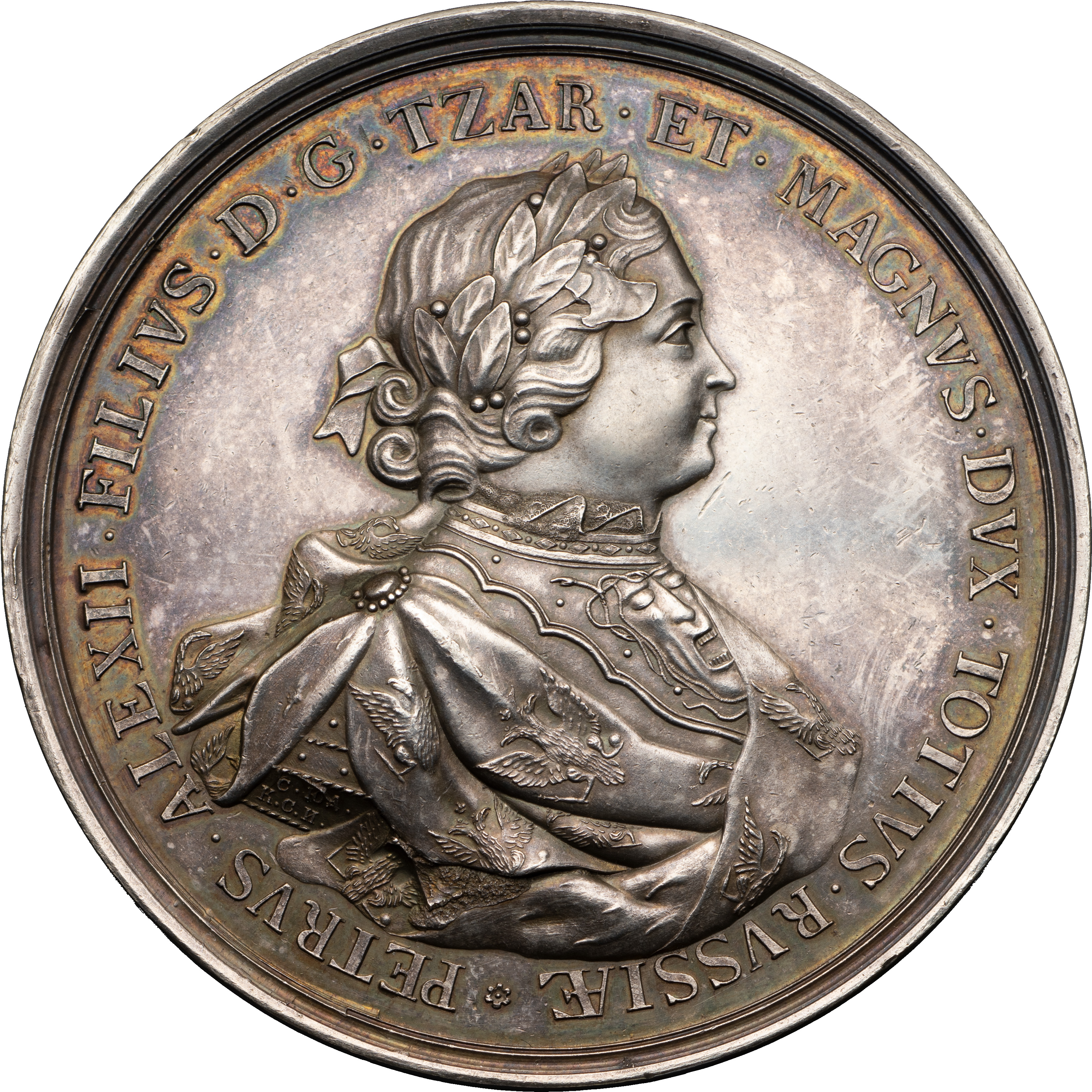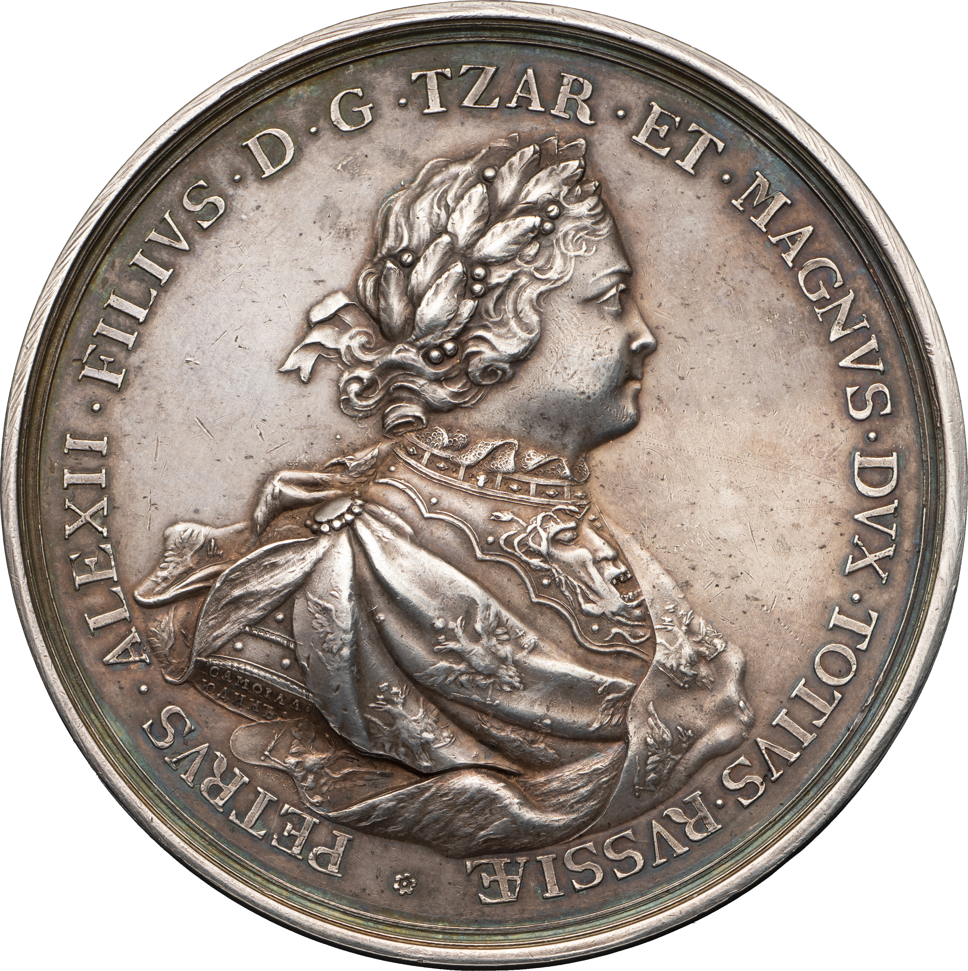 Медаль в память усмирения стрельцов в 1698 г. СПб монетный двор. Медальер С.Ю. Юдин, ок. 1759 г., по рисунку Я. фон Штелина (лиц. ст. — на обрезе правой руки: САМОIЛА / ЮДИНЪ; об. ст. — на обрезе изображения: ·ВЫРЕЗЫВАЛЪ·САМОIЛА· ЮДИНЪ·). Серебро; 102,46 г. Диаметр 65,9-66,1 мм (овальность). Иверсен# IX.1. Смирнов# 161, сноска *****. Дьяков# 9.1 (R2). Соколов# 046 (R2). Аналог см. Великие Русские победы в медали и гравюре, 1709. # 14 (бронза). Сохранность почти отличная. Редкая.