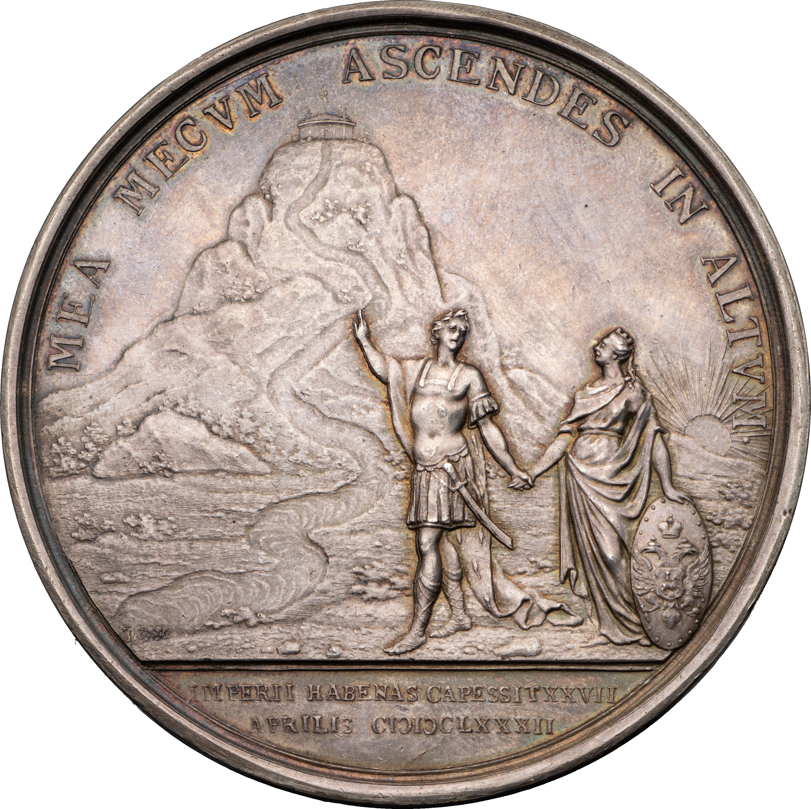 Надписи (лат.): на лиц. ст. медали по окружности — «PETRVS ALEXII FILIVS•D•G•TZAR•ET•MAGNVS•DUX•TOTIUS•RVSSIÆ» (Петр, Алексея сын, Божьей милостью Царь и Великий Князь Всея Руси); на об. ст. медали: вверху по окружности — «MEA MECVM ASCENDES IN ALTVM» ([Ты] моя [и] со мной восходишь на вершину), под обрезом изображения в две строки: «IMPERII HABENAS CAPESSIT XXVII / APRILIS MDCLXXXII» (Он взял бразды правления 27 апреля 1682).