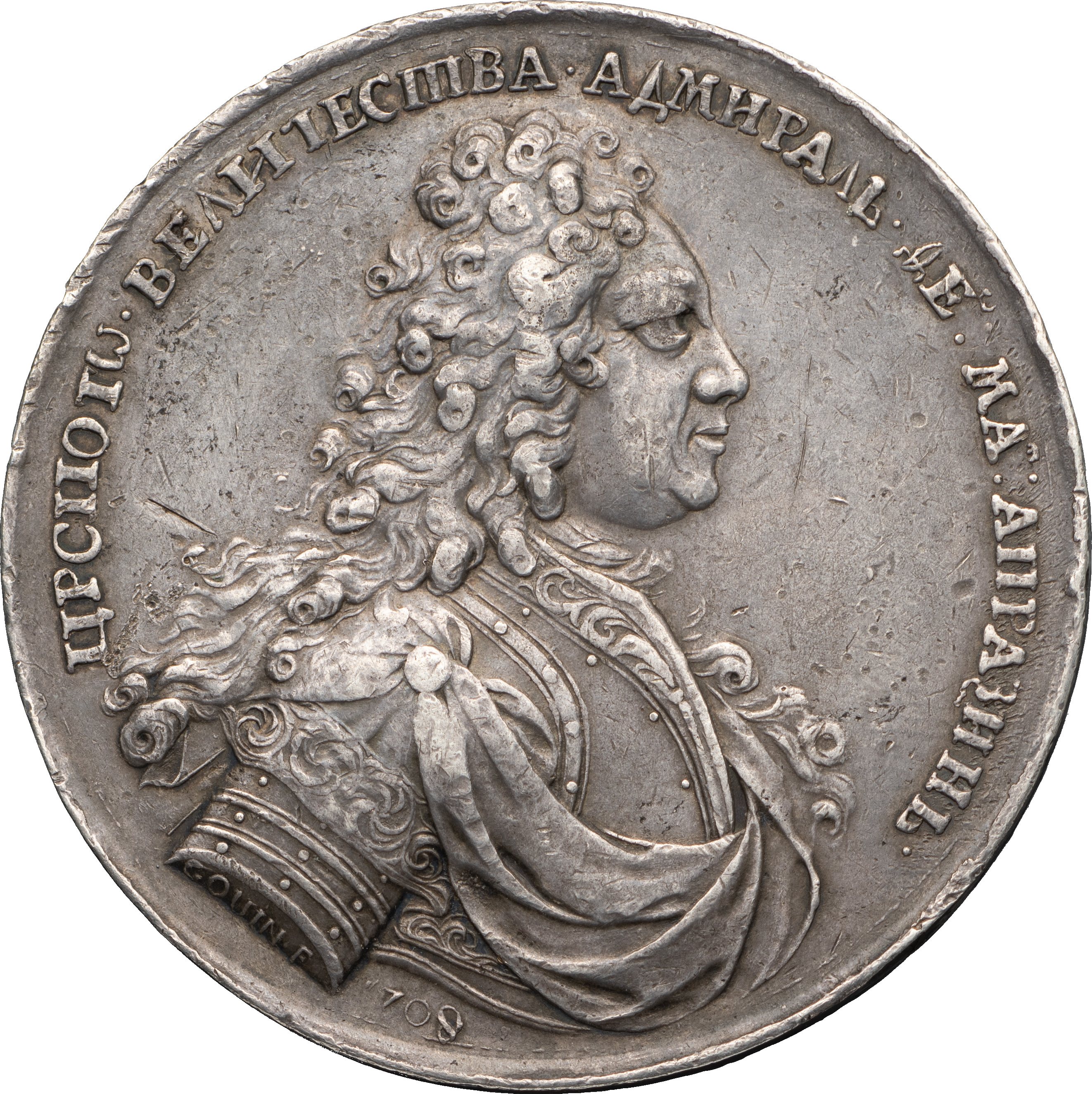 Медаль в память заслуг адмирала Ф.М. Апраксина, 1708 г. Московский монетный двор, 1708 г. Медальеры: лиц. ст. — С. Гуэн (на обрезе изображения: GOUIN•F), об. ст. — Г. Хаупт (внизу: HAUPT F.). Серебро; 80,56 г. Диаметр 53,1 мм. Дьяков# 26.1 (R4). Великие русские победы, 1709. # 270. Аналог см. Смирнов# 179. Сохранность очень хорошая. Очень редкая.