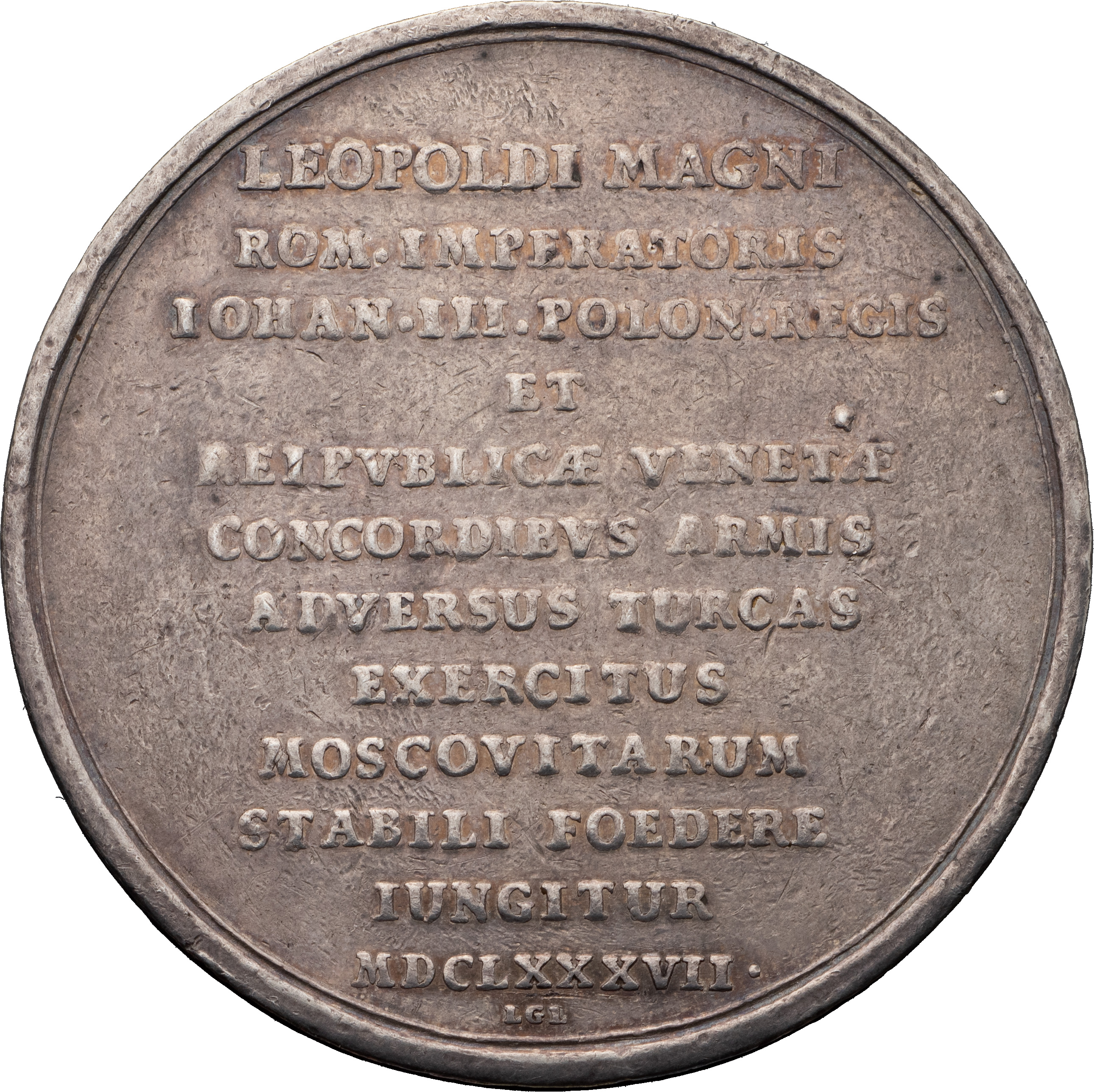 Медаль в память образования “Священной лигиˮ. Германия. Нюрнберг, 1687 г. Медальеры: лиц. ст. — Г. Хаутч (Georg Hautsch, лиц. ст. — внизу: GH), об. ст. — Л.Г. Лауффер (Lazarus Gottlieb Lauffer; внизу: L.G.L.). Серебро; 33,43 г. Диаметр 45,0 мм. Щукина Е.С. О России за ее пределами. Западноевропейские медали собрания Эрмитажа на события истории России конца XVII — первой четверти XVIII века // «Прошлое нашей Родины в памятниках нумизматики». ГЭ. Л., 1977, с. 128, табл. 1, # 2, лиц. ст.). Сохранность очень хорошая. Редкая.
