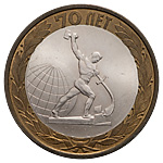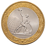 10 рублей 2015 года, СПМД, «70 лет Победы. Перекуем мечи на орала». Пробные. Об. Ст.: неутвержденный вариант — иной рисунок координатной сетки земного шара. Гурт рубчатый, без надписи. Биметалл, 8,43 г. Сохранность отличная. Очень редкие.