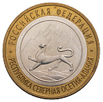 10 рублей 2013 года, СПМД. «Республика Северная Осетия-Алания». Биметалл, 7,92 г. Экспериментальный образец — кольцо и вставка магнитные. Гурт рубчатый, без надписи. Сохранность отличная. Редкие.