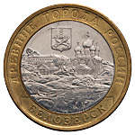 10 рублей 2012 года, СПМД, «Белозерск». Экспериментальный образец — кольцо и вставка магнитные. Биметалл, 7,93 г. Сохранность отличная, лёгкая патина, штемпельный блеск. Редкие.