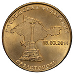 10 рублей 2014 года, СПМД. «Севастополь». Экспериментальный чекан на нестандартной монетной магнитной заготовке. Сталь плакированная латунью, 4,00 г. Сохранность отличная, лёгкая патина, штемпельный блеск. Редкие.