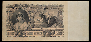 Эмиссионная касса Английского банка в г. Архангельске «СЕВЕРНАЯ РОССИЯ». Государственный Кредитный Билет 500 рублей 1918 года, ЦС 031378. На аверсе билета орлы с коронами заштемпелеваны. Сохранность очень хорошая. Кардаков# II.1. 29 (120 дойчмарок). Рябченко# 2052. Исключительно редкий.