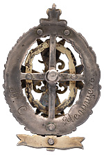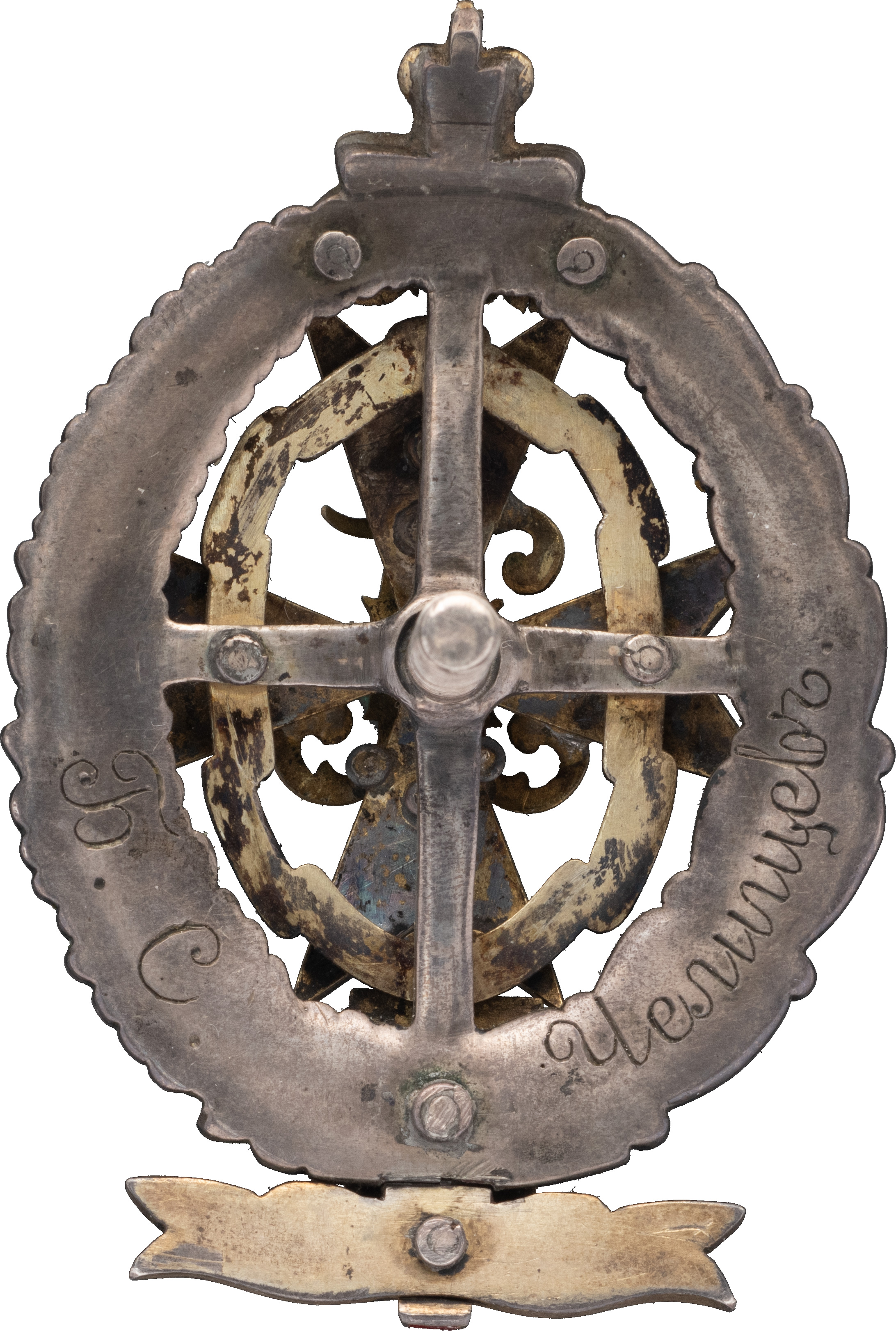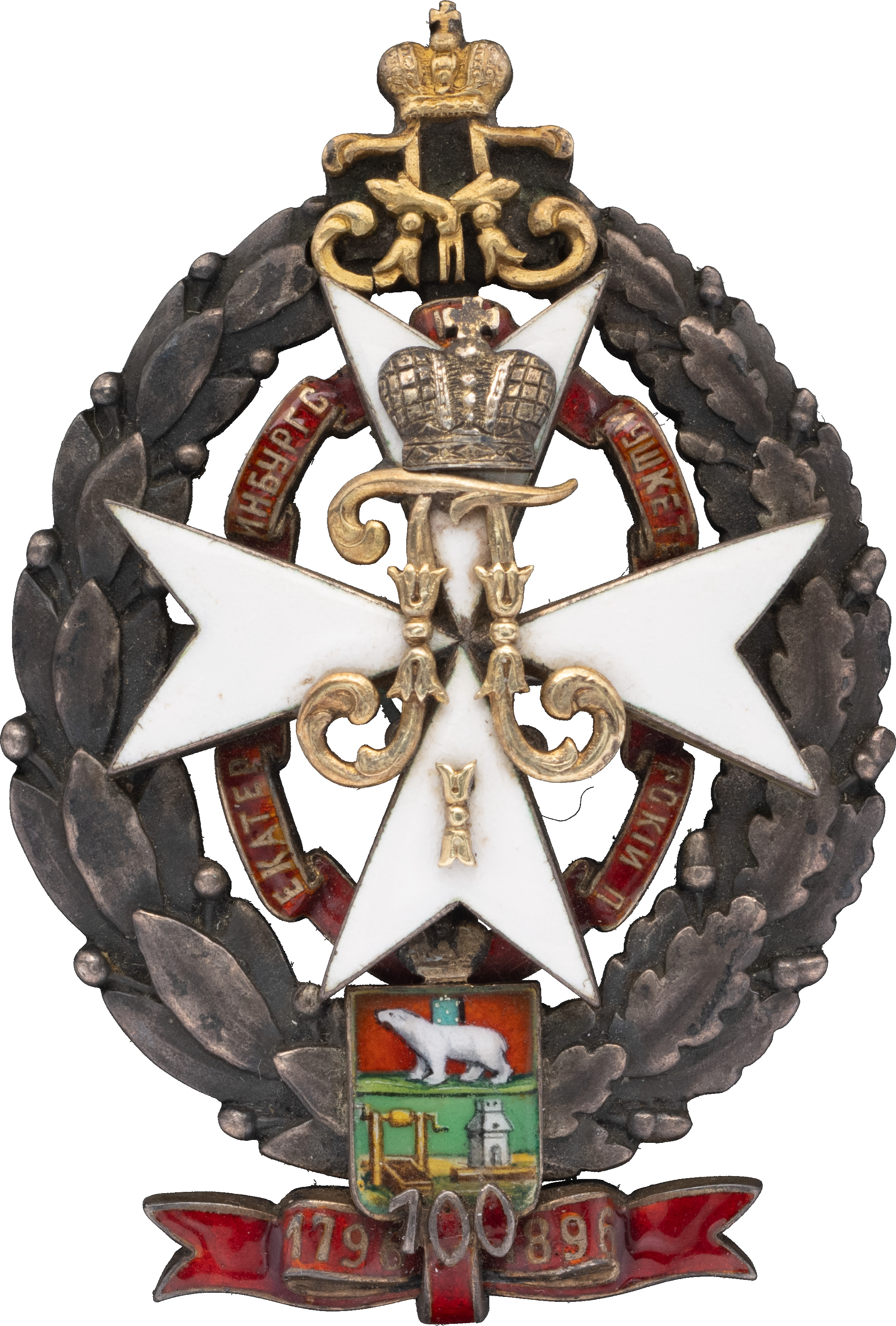 Знак 37-го пехотного Екатеринбургского полка. Российская Империя, 1910–1917 гг. Неизвестная мастерская. Серебро, позолота, эмаль, 44,12 г. Размеры 58,5×39,5 мм. Сохранность отличная, красивая патина. Патрикеев, Бойнович.2# 4.2.37. Утвержден 5 мая 1910 г. Принадлежал Б.С.Челищеву. Гравировка на об. ст. знака внизу по окружности: «Б.С. — Челищевъ.». Очень редкий.