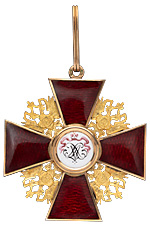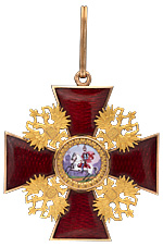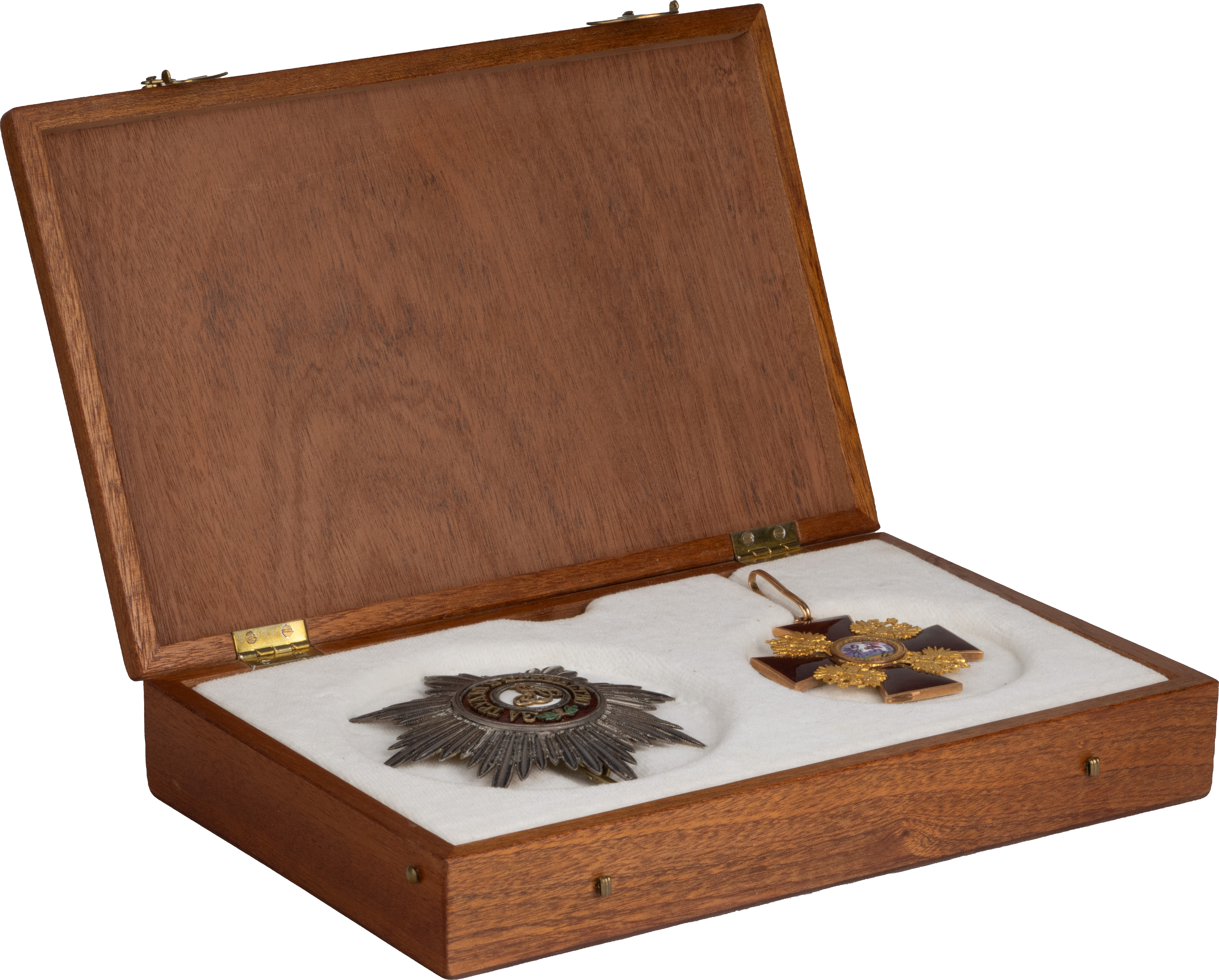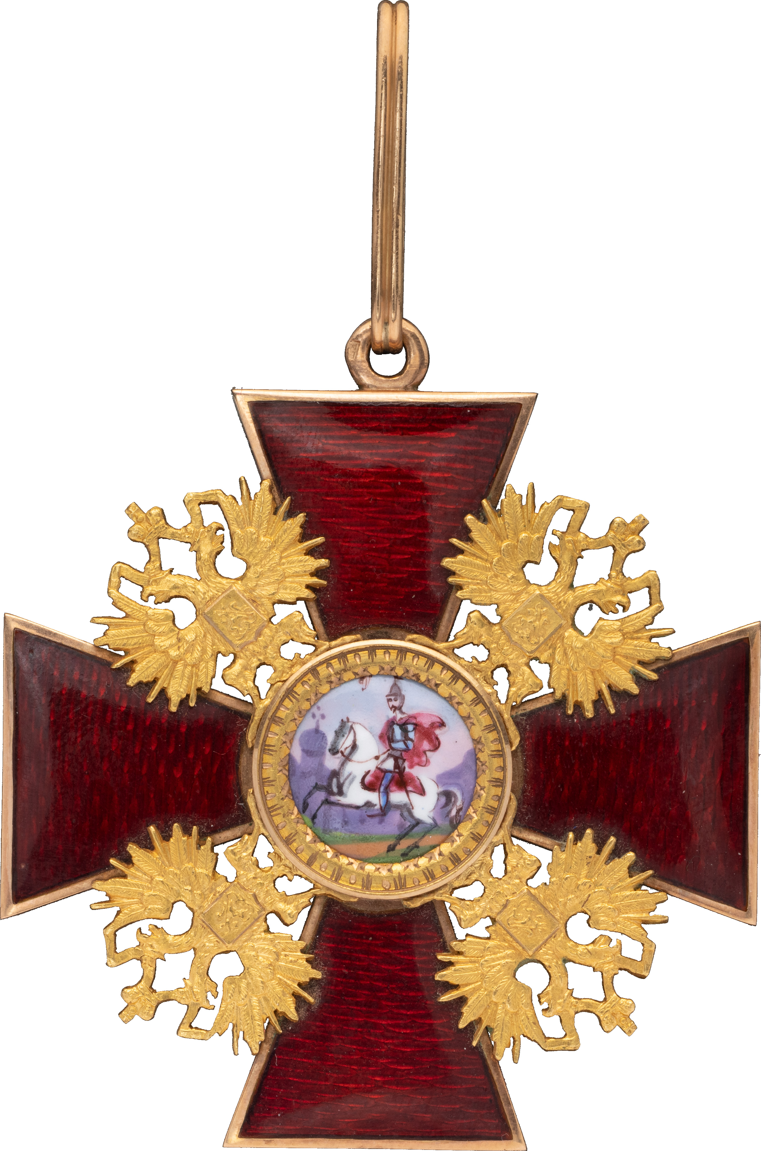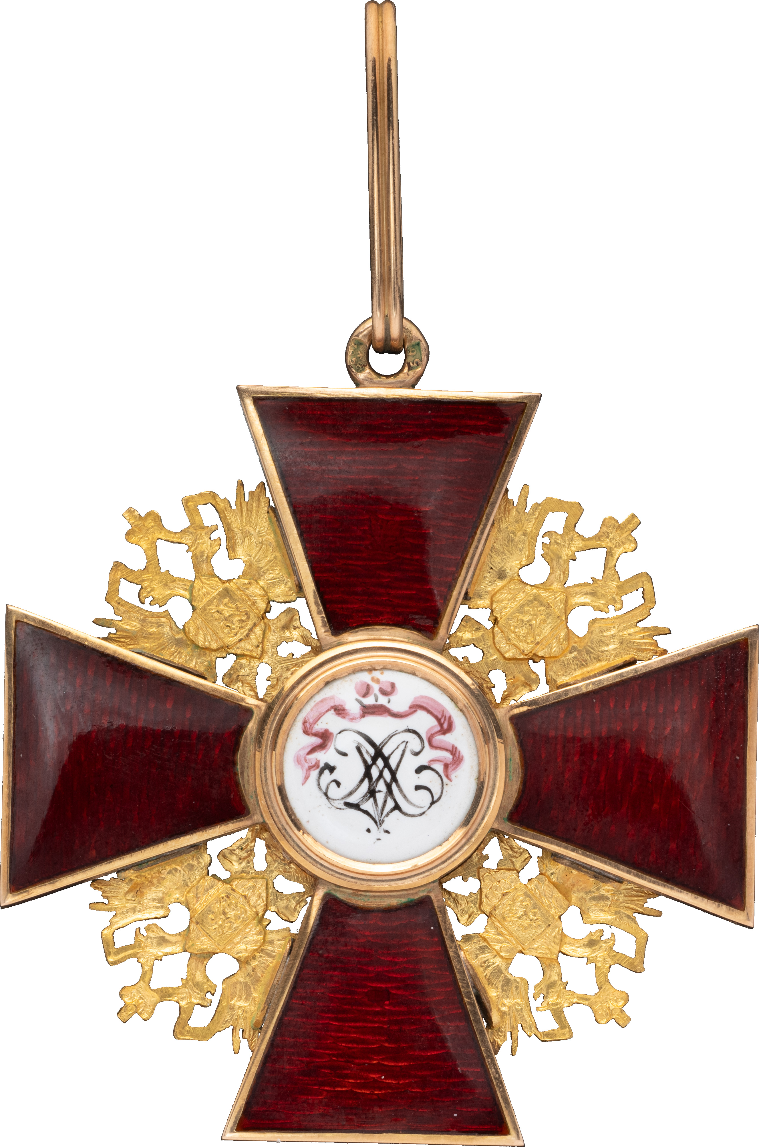 1. Знак ордена. С.-Петербург, 1858 г. Фирма «Кейбель». Клейма: на об. ст. знака ордена, на ушке — городское клеймо С.-Петербурга с датой 1858 и проба металла «56»; на концах креста под эмалью, вверху — Государственный герб, внизу — именное клеймо «WK»; на ушке с лиц. ст. знака ордена — французское пробирное клеймо для подержанных изделий из низкопробного золота с 1919 г. для г. Парижа [ET в прямоугольном щитке]. Золото, эмаль, 28,36 г. Размеры 59,7×54,1 мм. Сохранность отличная.