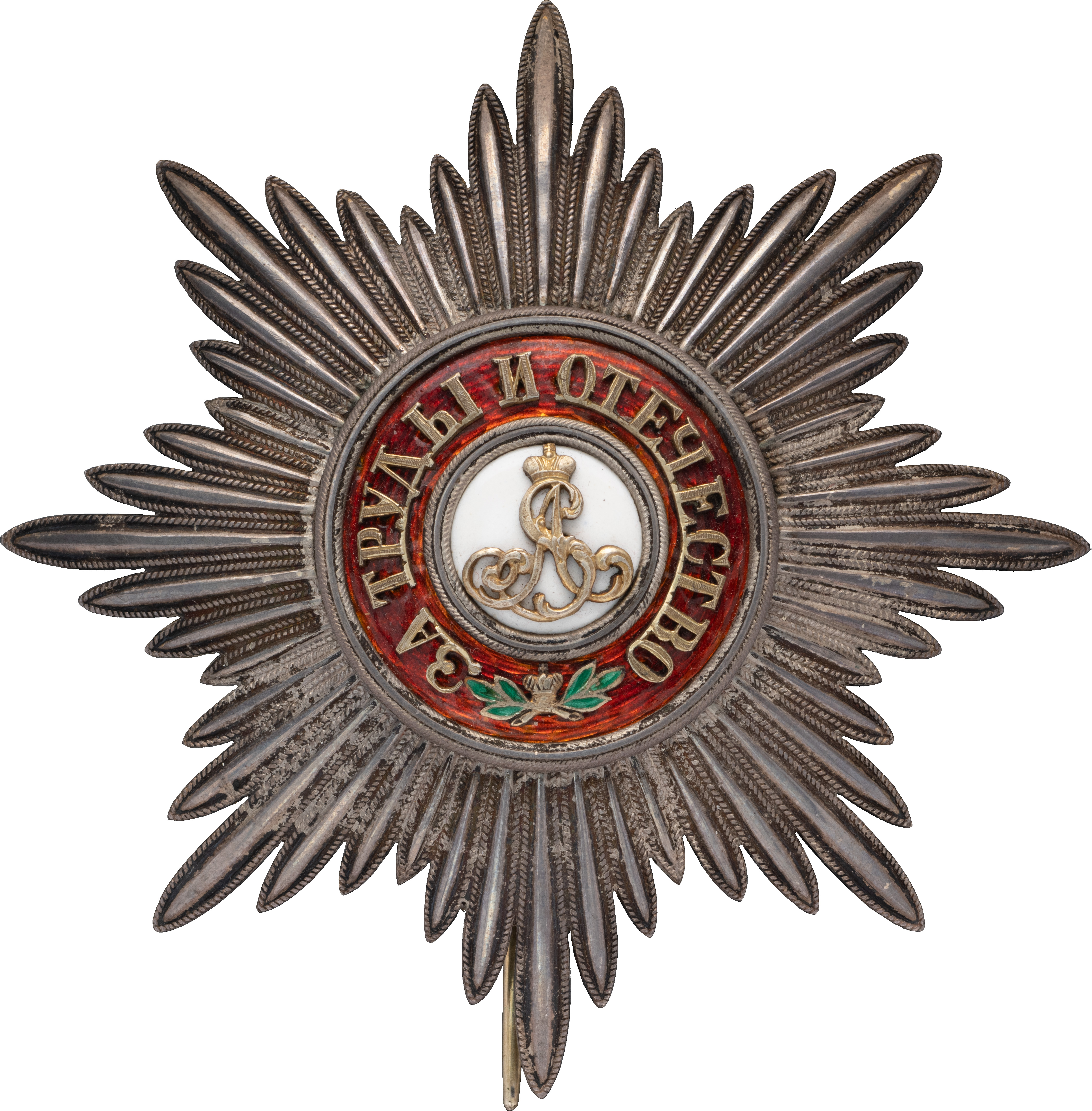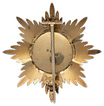 2. Звезда ордена. С.-Петербург, 1848–1864 гг. Фирма «Кейбель». Клейма: на об. ст. в центре звезды — городское клеймо С.-Петербурга, проба металла «84» и клеймо фирмы «Keibel»; на булавке с внутренней стороны — проба металла «84» и клеймо фирмы «Keibel»; на булавке с наружной стороны и на застежке булавки — французское клеймо для серебряных подержанных изделий неизвестного или неопределенного происхождения, импортированных и проданных во Франции в 1919–1984 гг. [лебедь, влево, в овальном щитке]. Серебро, позолота, эмаль, 43,99 г. Размеры 87,9×87,3 мм. Сохранность отличная, красивая патина.