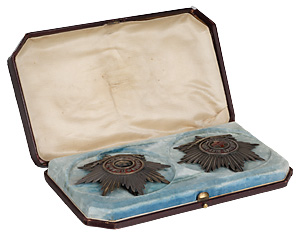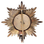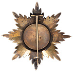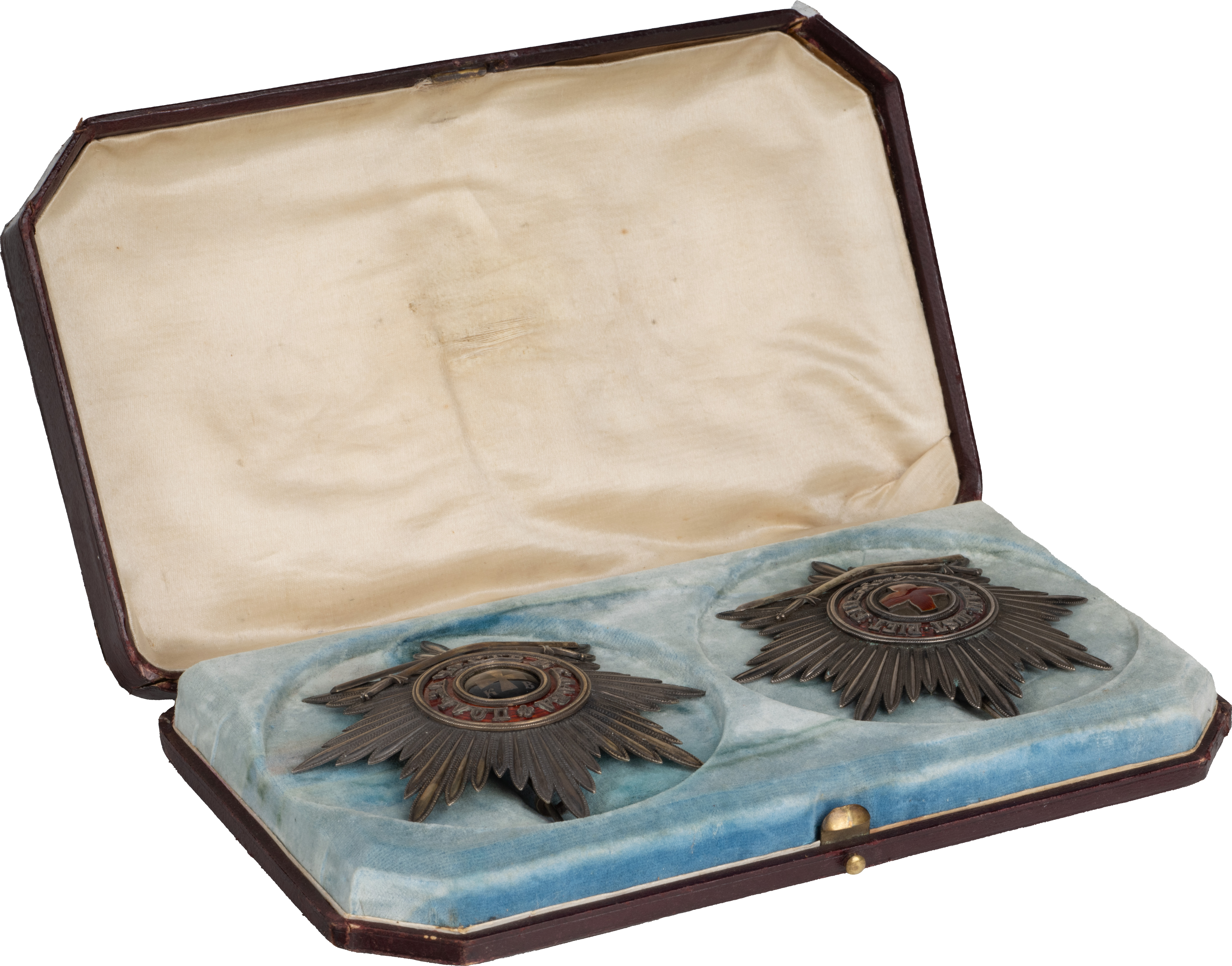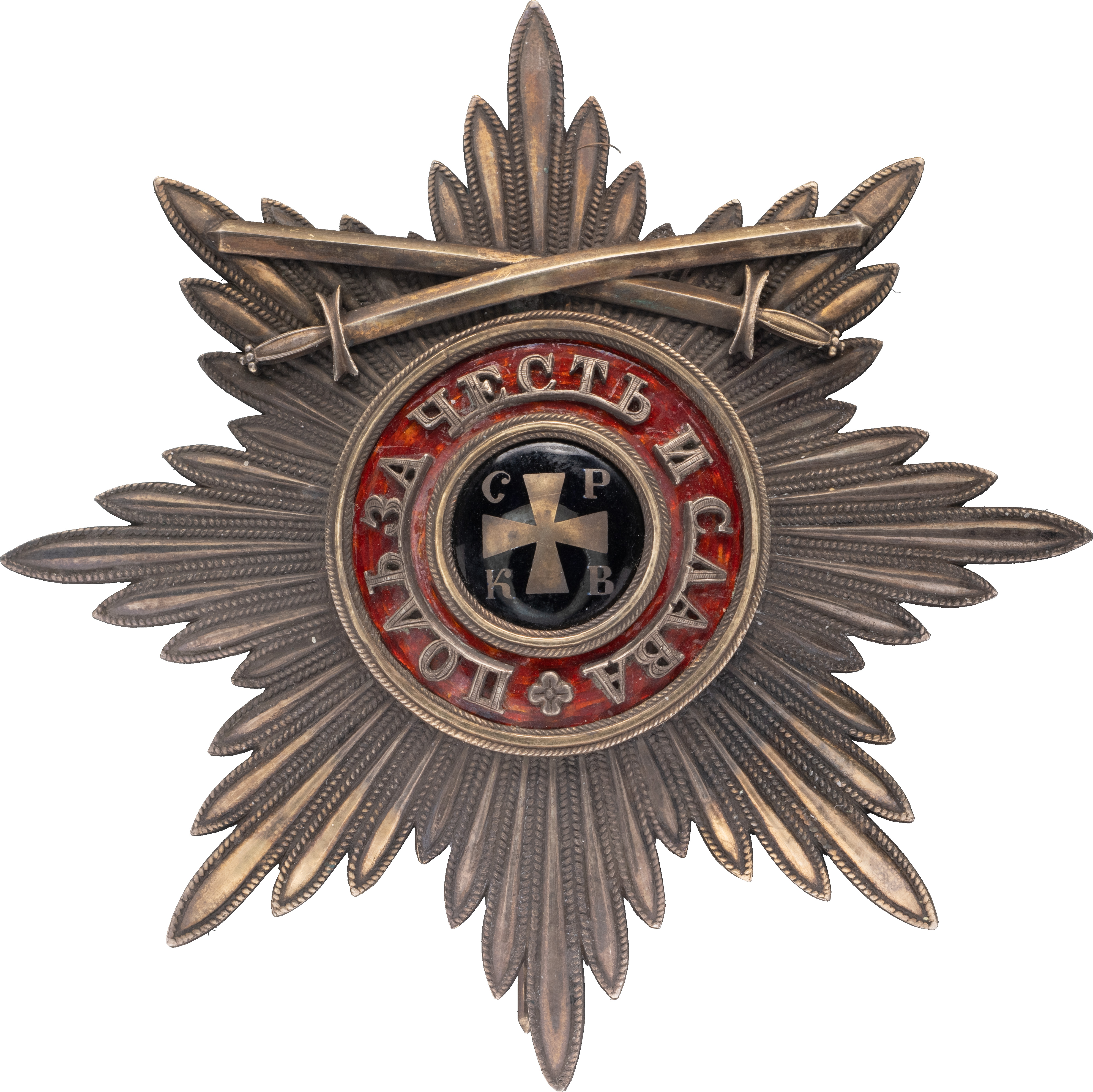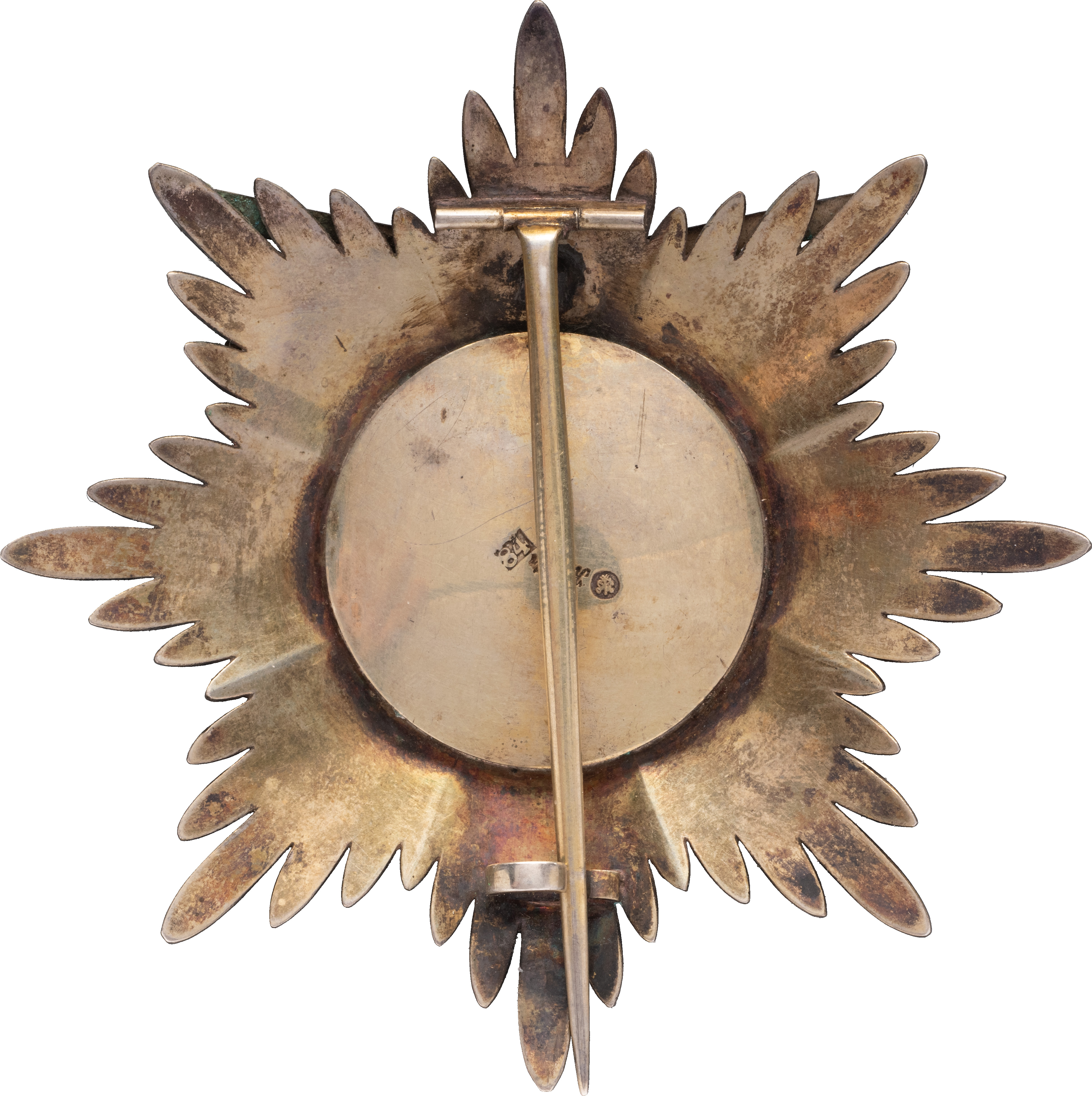 1. Звезда ордена Святого равноапостольного князя Владимира с мечами на верхних лучах. С.-Петербург, 1855–1870 гг. Фирма «Кейбель». Клейма: на об. ст. звезды — проба металла «84», Государственный герб, клеймо фирмы «Keibel» и городское клеймо С.-Петербурга; на булавке с внутренней стороны — Государственный герб, клеймо фирмы «Keibel» и городское клеймо С.-Петербурга; на застежке булавки — городское клеймо С.-Петербурга и два французских пробирных клейма. Серебро, позолота, эмаль, 52,45 г. Размеры 92,1×91,9 мм. Сохранность отличная, мелкие царапины на эмали, красивая патина.
