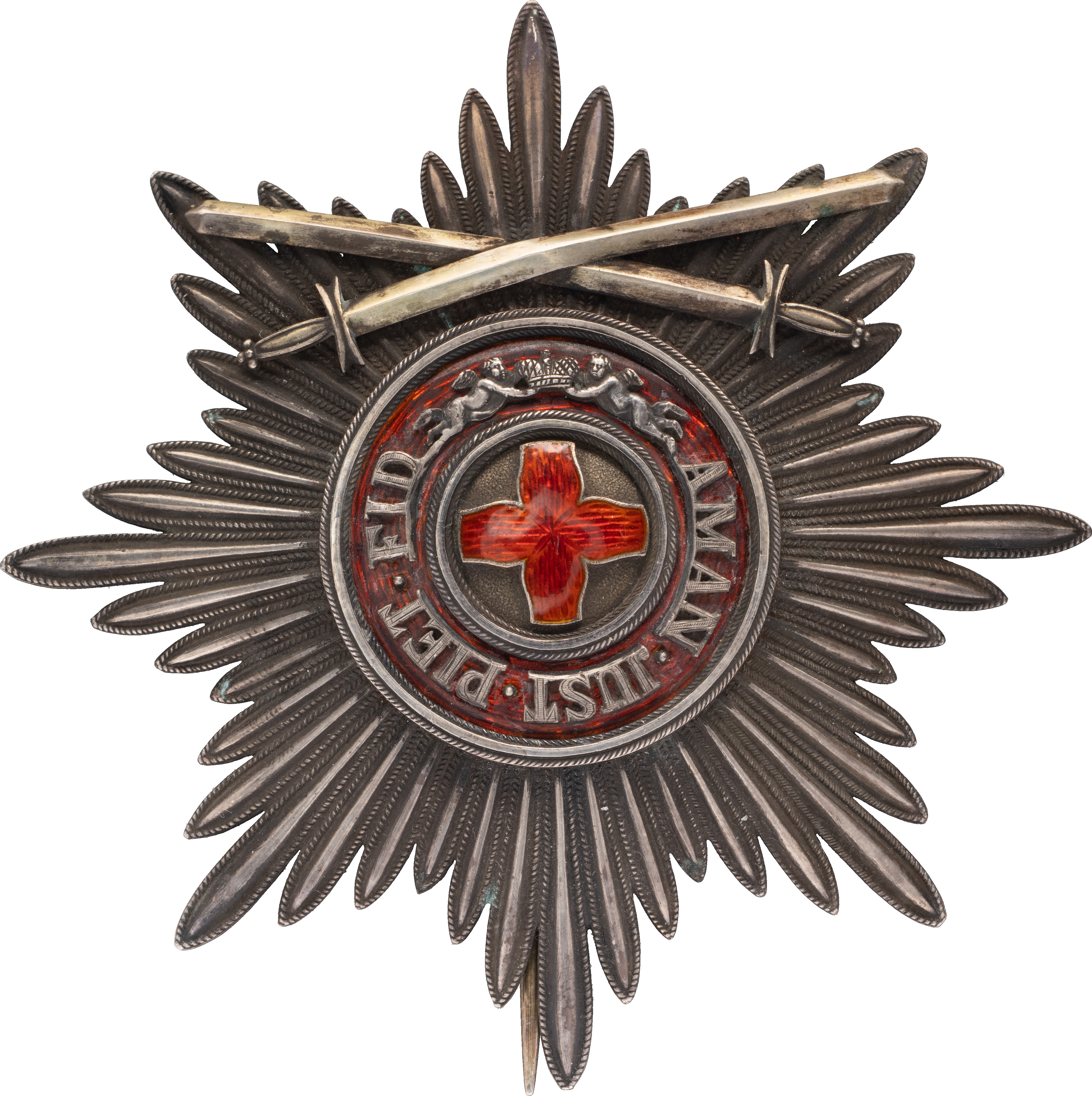 2. Звезда ордена Святой Анны с мечами на верхних лучах. С.-Петербург, 1855–1870 гг. Фирма «Кейбель». Клейма: на об. ст. звезды — проба металла «84», клеймо фирмы «Keibel» и городское клеймо С.-Петербурга; на булавке с внутренней стороны — проба металла «84» и клеймо фирмы «Keibel». Серебро, позолота, эмаль, 54,12 г. Размеры 88,6×88,6 мм. Сохранность отличная, красивая патина.