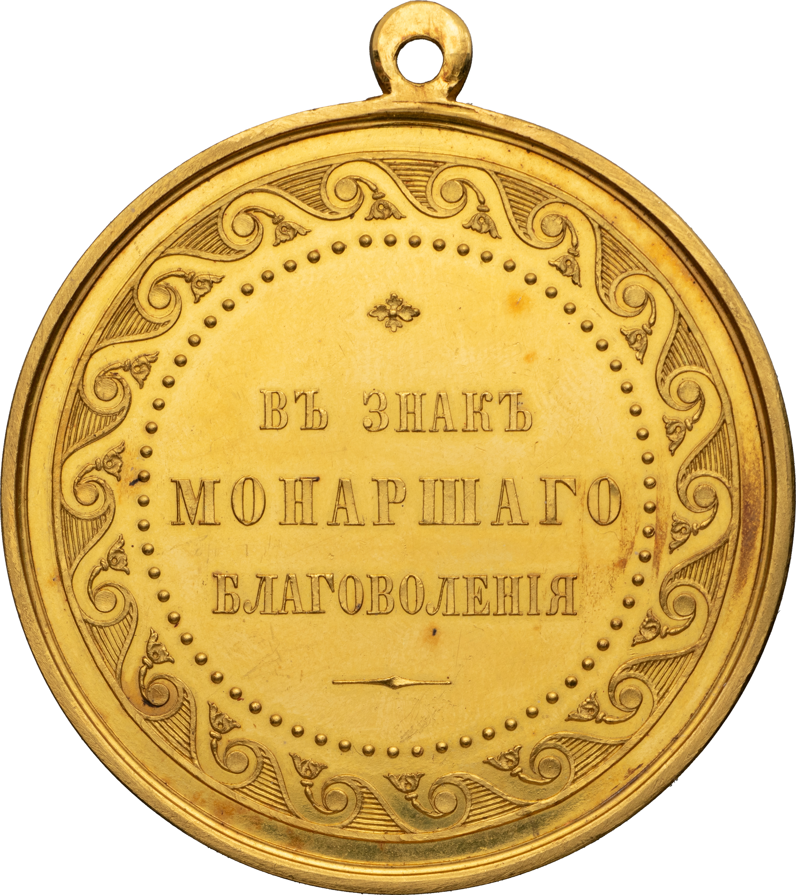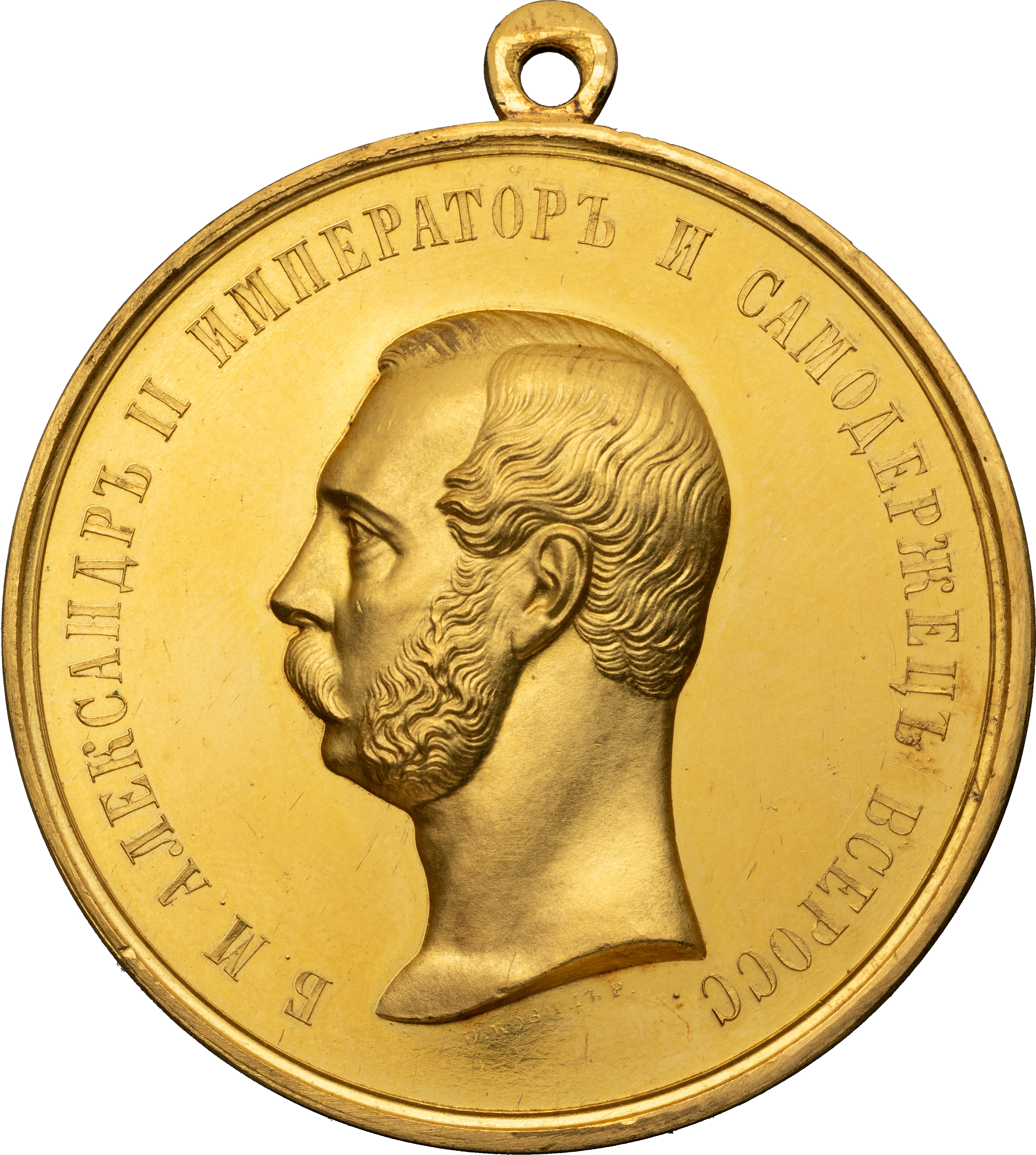 Медаль «В знак Монаршего благоволения» с портретом Императора Александра II. СПб монетный двор, 1865–1869 гг. Медальер лиц. ст. Н.А.Козин (под изображением: Н.КОЗИНЪ Р.). Золото, 68,73 г. Диаметр 51,0 мм. Сохранность близкая к превосходной, зеркальное поле. Смирнов# 607, штемпель лиц. ст. см. Смирнов# 559/а.2. Петерс# 124.д. Петерс А II# 11.д. Дьяков# 641.2 (R5). Биткин# Н934 (R4). Исключительно редкая.