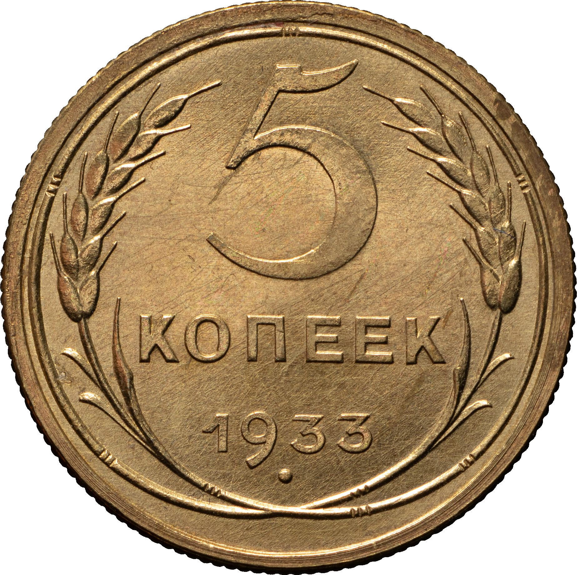 5 копеек 1933 года. Чекан специального качества. Бронза, 4,85 г. Сохранность отличная, штемпельный блеск, покрытие лаком. Петров, Федорин# 68, Р-1. ФедоринVI# 19 (Н). Очень редкие.