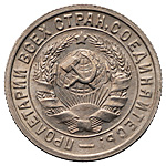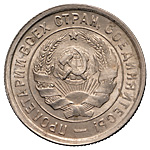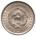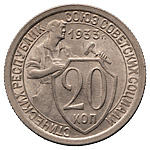 15 копеек 1933 года. Лиц. ст.: шт. 1.2 — под бойком молота три параллели. Мельхиор, 2,50 г. Сохранность отличная, красивая патина, мелкие царапинки. ФедоринVI# 55.