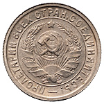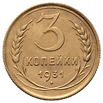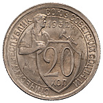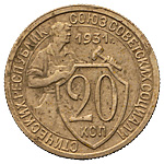 20 копеек 1931 года. «Перепутка» по металлу. Бронза, 3,00 г. Сохранность очень хорошая, чистка, следы коррозии. ФедоринVI# 001-ДМ (Р-3). Очень редкие. Производственный брак монетного двора: чеканка на заготовке, предназначенной для монеты другого номинала — 3 копейки.