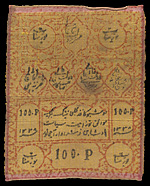 Хивинское ханство. 100 рублей 1919 года. Шелк. Сохранность очень хорошая. Кардаков# IX.5.16 (20 дойчмарок). Рябченко# 20232. Очень редкие.