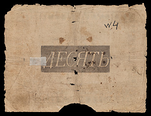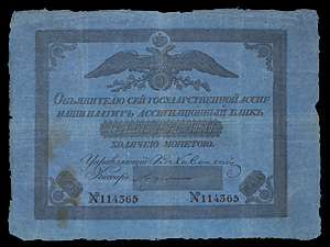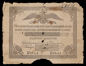 Государственная Ассигнация 10 рублей 1835 года, № 88441. Сохранность очень хорошая, внизу по краю утеря участка поля. Кардаков# I.1.347 (20 дойчмарок). Денисов# А-11.12. Рябченко# 315 (Р). Очень редкая.