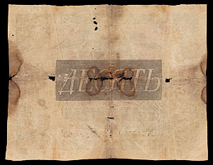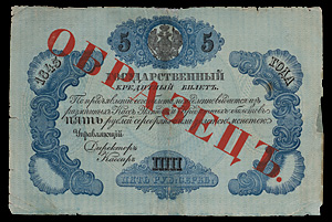 Государственный Кредитный Билет 5 рублей 1843 года, б/№ . «Образец». Без водяного знака. Сохранность очень хорошая, левый край билета восстановлен. Кардаков# I.1.409 (12 дойчмарок). Денисов# К-3.1. Рябченко# 369 (РРР). Очень редкий.