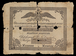 Государственная Ассигнация 10 рублей 1829 года, № 216832. Сохранность хорошая. Кардаков# I.1.311 (20 дойчмарок). Денисов# А-11.8. Рябченко# 280 (РР). Очень редкая.