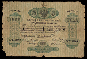 Государственный Кредитный Билет 3 рубля серебром 1855 года