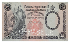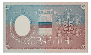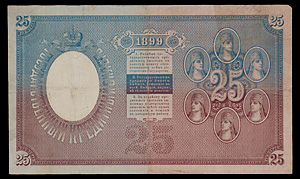 Государственный Кредитный Билет 25 рублей 1899 года, ВБ 871054. Подписи: управляющий Тимашев, кассир Овчинников. Сохранность очень хорошая. Кардаков# I.1.692 (2,5 дойчмарки). Денисов# К-30.2. Рябченко# 707а. Редкий.