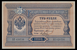 Государственный Кредитный Билет 3 рубля 1898 года, ВЗ 620736. С подписью управляющего С. Тимашева, кассир Я. Метц. Сохранность очень хорошая +. Кардаков# I.1.687 (1,5 дойчмарки). Денисов# К-25.2. Рябченко# 702а. Довольно редкий.