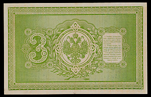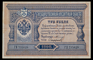 Государственный Кредитный Билет 3 рубля 1898 года, ГП 735629. С подписью управляющего С. Тимашева, кассир Софронов. Сохранность очень хорошая +. Кардаков# I.1.687 (1,5 дойчмарки). Денисов# К-25.2. Рябченко# 702а. Довольно редкий.