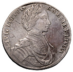 1 рубль 1712 года, G. Портрет работы Соломона Гуэна. Лиц. ст.: пряжка на плаще, один ряд заклепок на рукаве. Об. ст.: орел узкий, цифры даты разделены точками. Серебро, 28,02 г. Сохранность очень хорошая, приятная патина, графити на обеих сторонах монеты . ГМ# 66.5. Severin# 292 (точка). Уздеников# 0530 (черта). Дьяков# 1. ДьяковЗС# 366 (R1). Биткин# 806 (R). Очень редкий, 8 рублей по Петрову.
