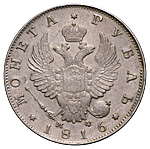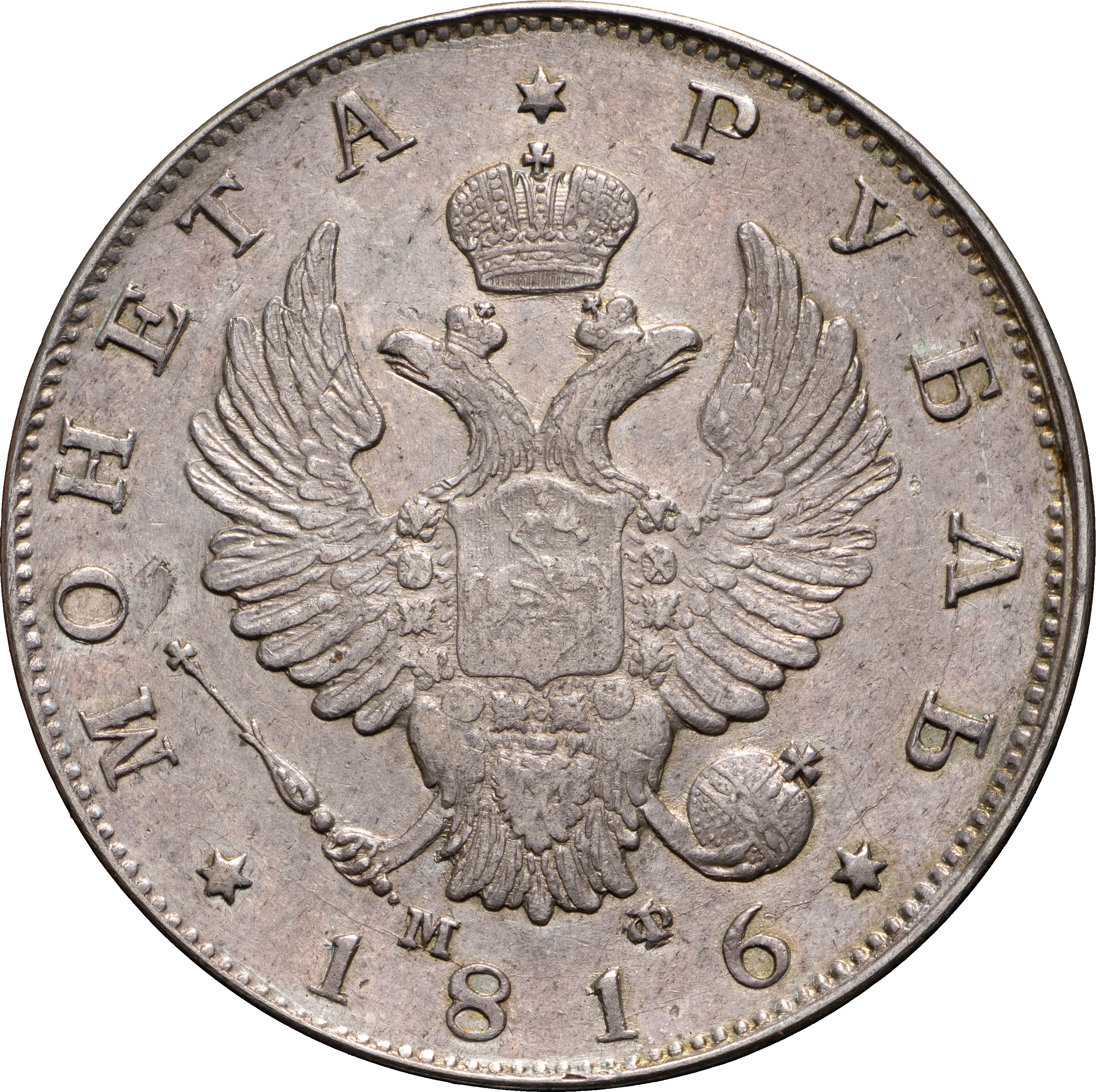 1 рубль 1816 года, СПБ-МФ. Лиц. ст.: орел образца 1815 года: малые короны высокие, скипетр длиннее. Серебро, 20,71 г. Сохранность почти отличная, легкая патина, чистка. ГМ# 13.12. Severin# 2718. Уздеников# 1428. Биткин# 113. Довольно редкий, 2 рубля по Петрову.