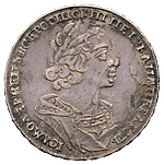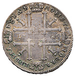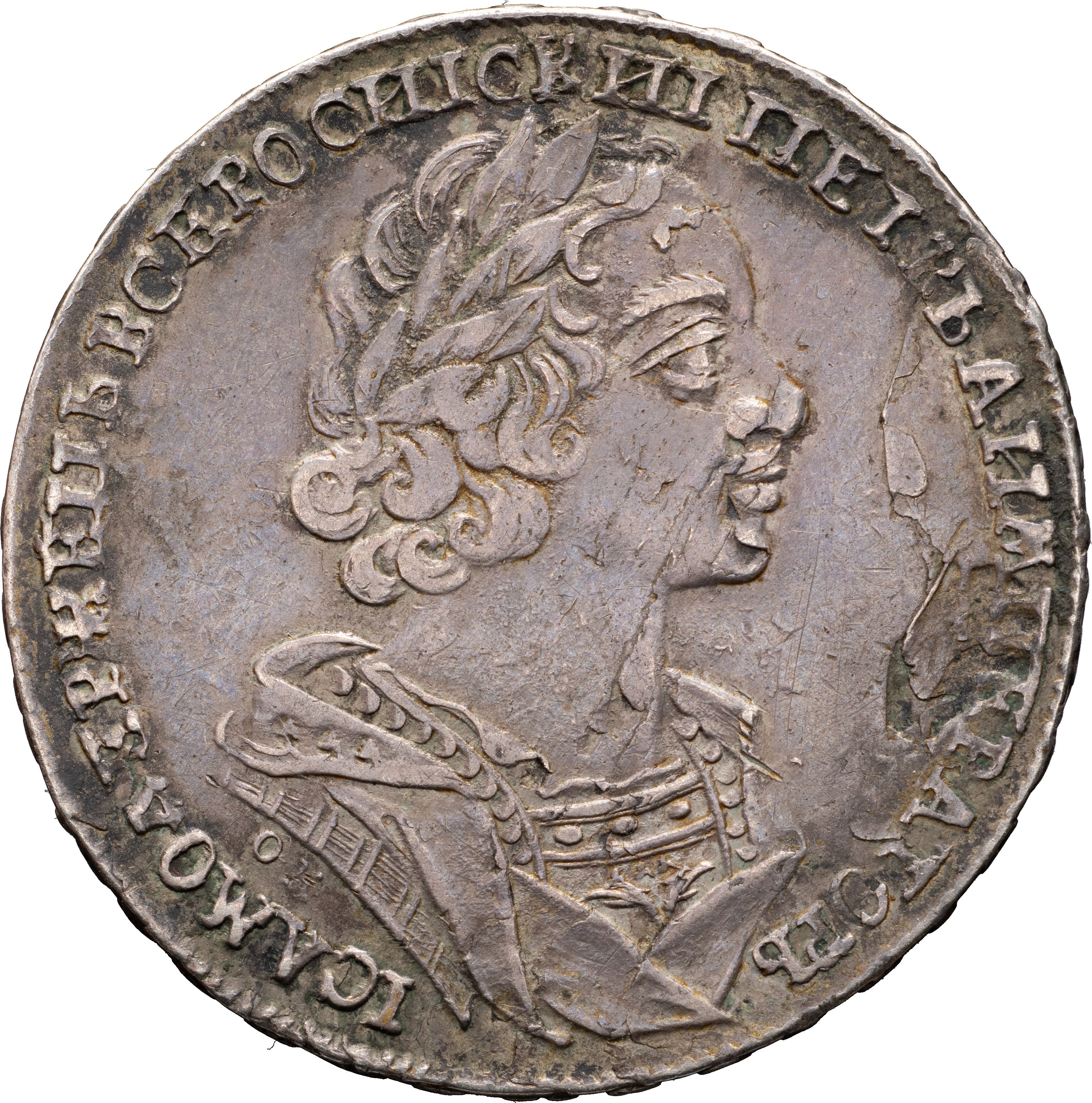1 рубль 1725 года, ОК. Лиц. ст.: портрет погрудный. Гурт: «РОССИСКОI * РУБЛЬ***** МОСКОВСКОГО ДВАР». Серебро, 27,55 г. Сохранность очень хорошая, густая патина, утрата фрагмента слойки. Severin# 680–683. Уздеников# 0625. Дьяков# 46, вар. ДьяковЗС# 1634 (R1). Биткин# нет. 2 рубля по Петрову.