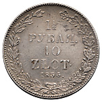1 1/2 рубля-10 злотых 1836 года, НГ. Лиц. ст.: малые короны высокие. Серебро, 30,76 г. Сохранность почти отличная, приятная старая патина, дефекты заготовки. ГМ# 12.8. Severin# 3171. Уздеников# 4118. Биткин# 1090. 2 рубля по Петрову.