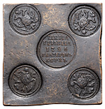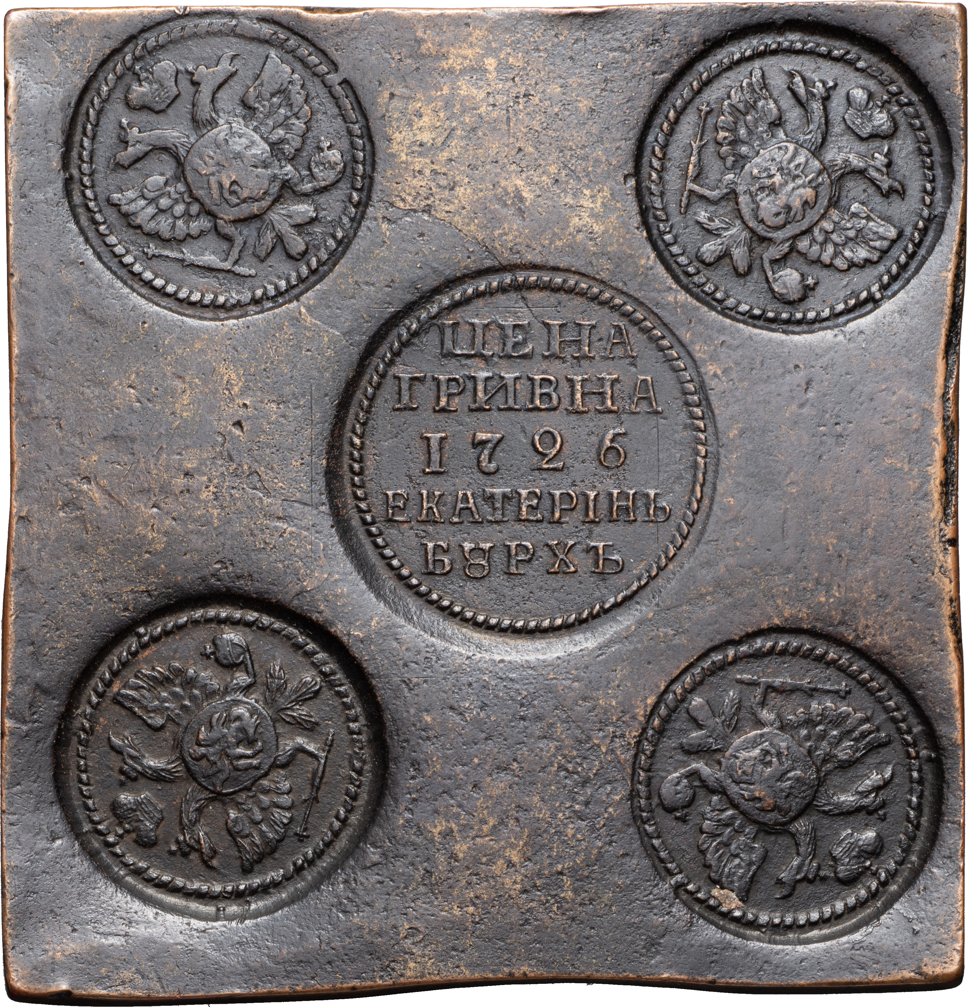 Гривна 1726 года, ЕКАТЕРИНБУРГ. Новодел. Лиц. ст.: «ЦЕНА ГРИВНА», на груди орлов Московский герб. Медь, 155,62 г. Формат: 60x61 мм. Сохранность очень хорошая, тёмная старая патина. ГМ# 26.11. Brekke# N 47 (черта). Уздеников# Н 4062 (черта). Дьяков# N 2. Биткин# Н 345 (R2). Редкая, 15 рублей по Ильину.