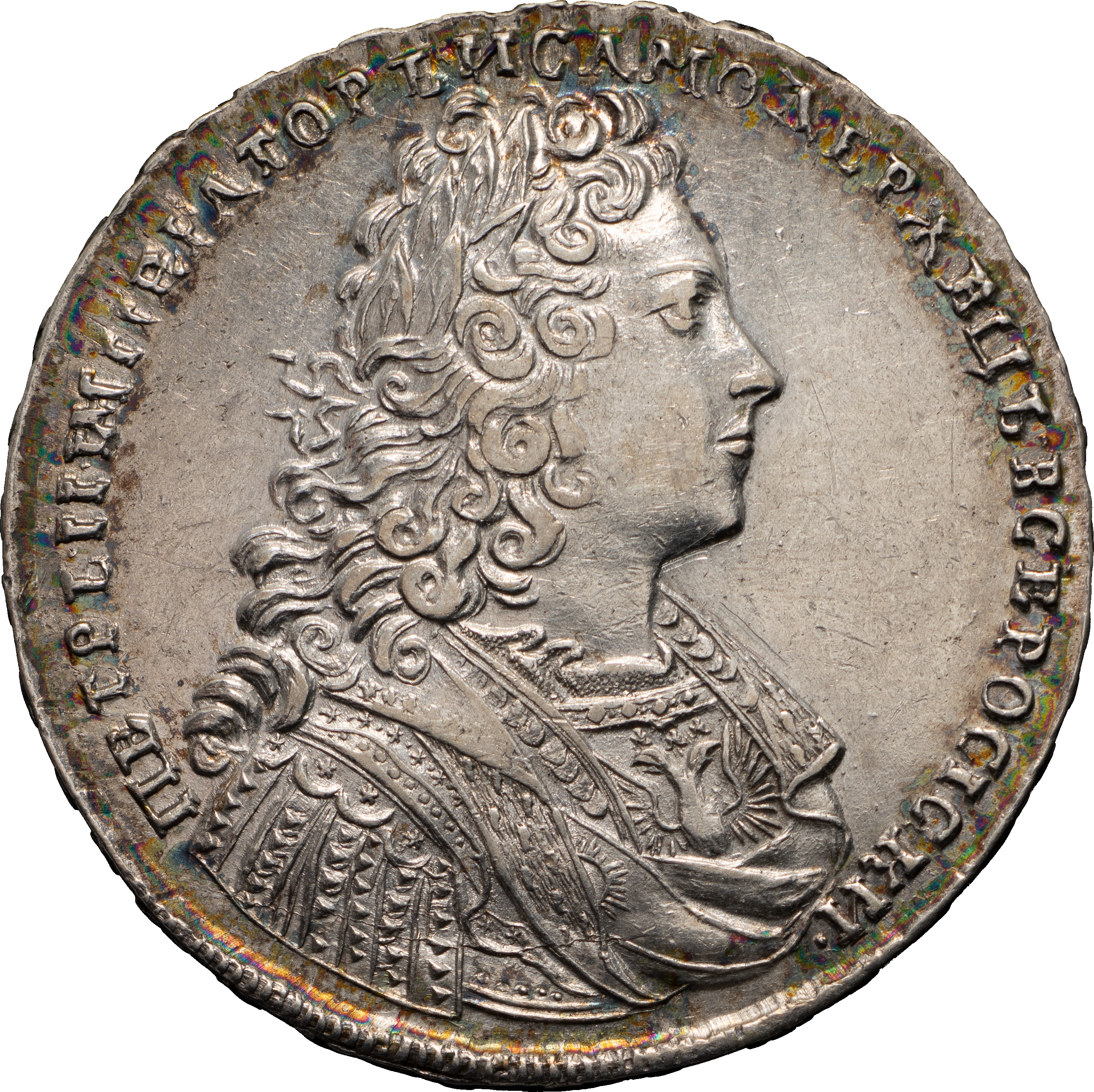 1 рубль 1728 года. Лиц. ст.: портрет образца 1728 года, со звездой на груди, шесть наплечников! Об. ст.: буква «Ц» без завитка, цифра «2» в дате закрытая. Серебро, 28,79 г. Сохранность очень хорошая, слойки, реставрация фрагментов поля. ГМ# нет. Severin# 985 (черта с точкой). Уздеников# 0686 (точка). Дьяков# нет. Биткин# 89 (R2). Петрунин# Н-№ 79.2 (черта с точкой). 3 рубля по Петрову. Очень редкий.