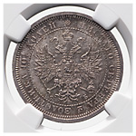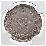 Полтина 1859 года, СПБ-ФБ. Об. ст.: корона и бант меньше. Серебро. Монета в пластиковой капсуле (слабе) NGC, MS 64. ГМ# 5.4. Severin# 3678. Уздеников# 1756. Биткин# 97. 75 копеек по Петрову.