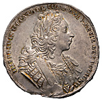 1 рубль 1729 года, портрет образца 1729 года. Лиц. ст.: портрет без заклепок над обрезом рукава. Об. ст.: точки разделяют надпись. Серебро, 28,56 г. Сохранность отличная, лёгкая патина, яркий штемпельный блеск, дефект заготовки. ГМ# нет. Severin# 1016. Уздеников# 0690. Дьяков# 25, вар. Биткин# нет. Петрунин# L-№ 146.2 (точка), приведено фото данного экземпляра! Интересный оригинальный вариант гравировки рисунка деталей аверса и реверса.