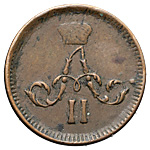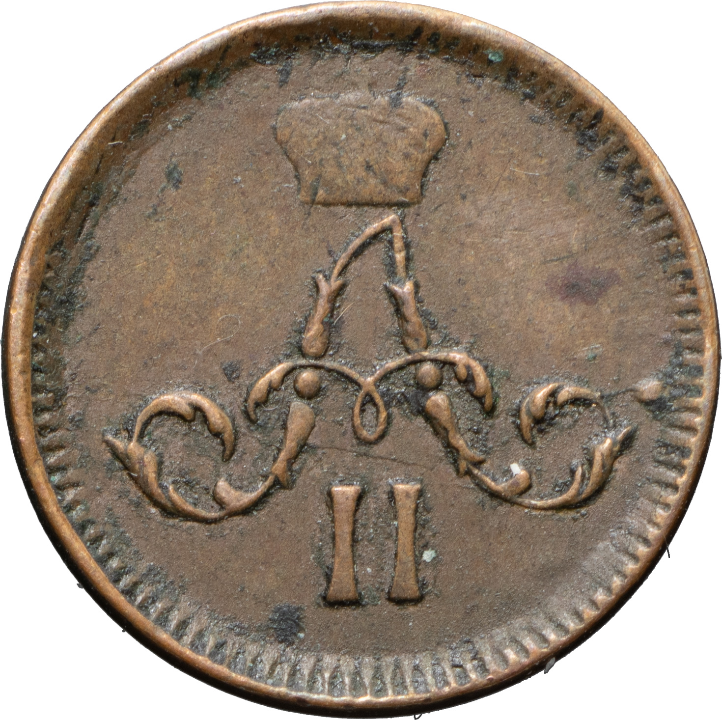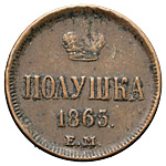 Полушка 1865 года, ЕМ. Медь, 1,25 г. Сохранность очень хорошая, густая патина. ГМ# 11.15 (очень редкая). Brekke# 14 (точка). Уздеников# 3661. Биткин# 389 (R1). Очень редкая, 2 рубля по Ильину.