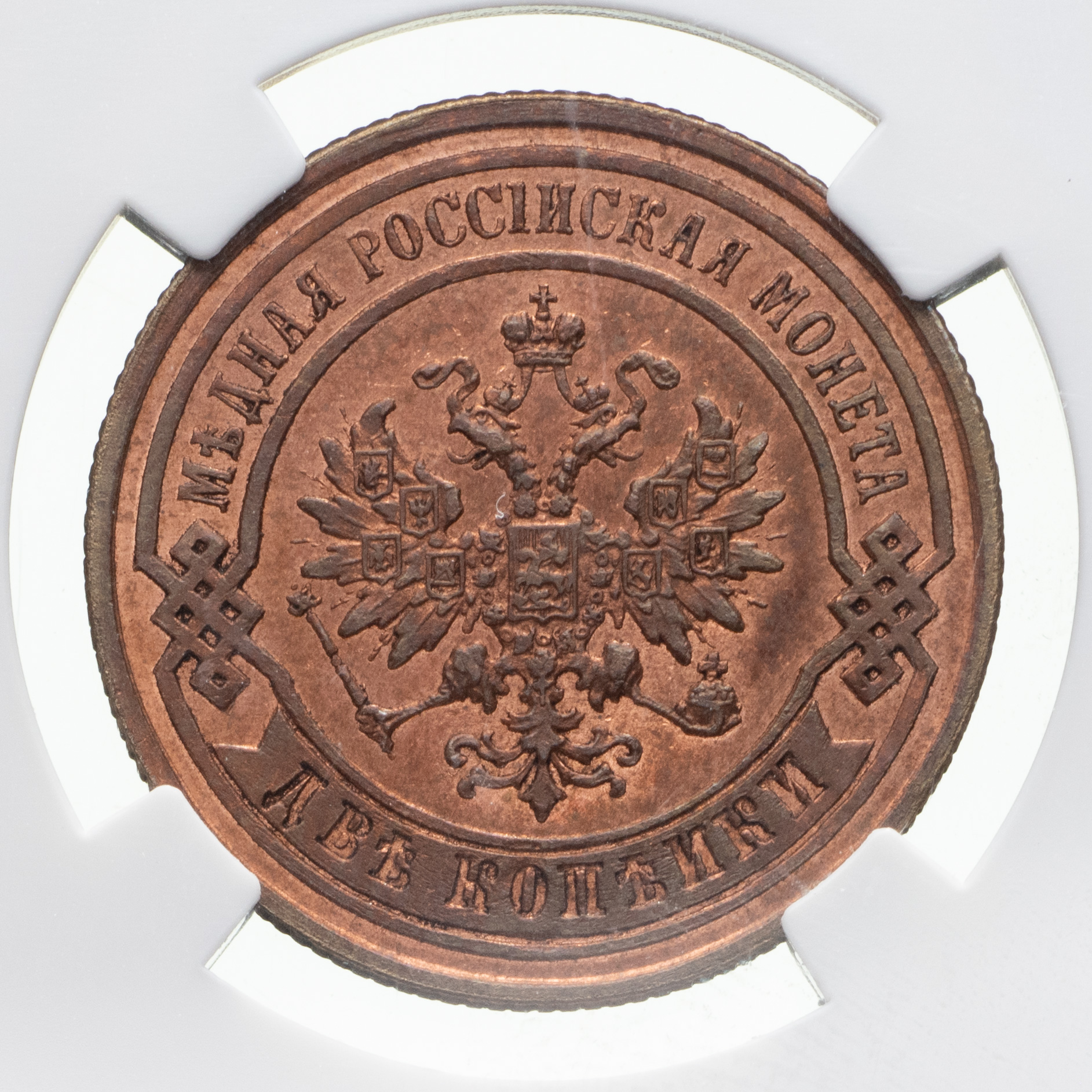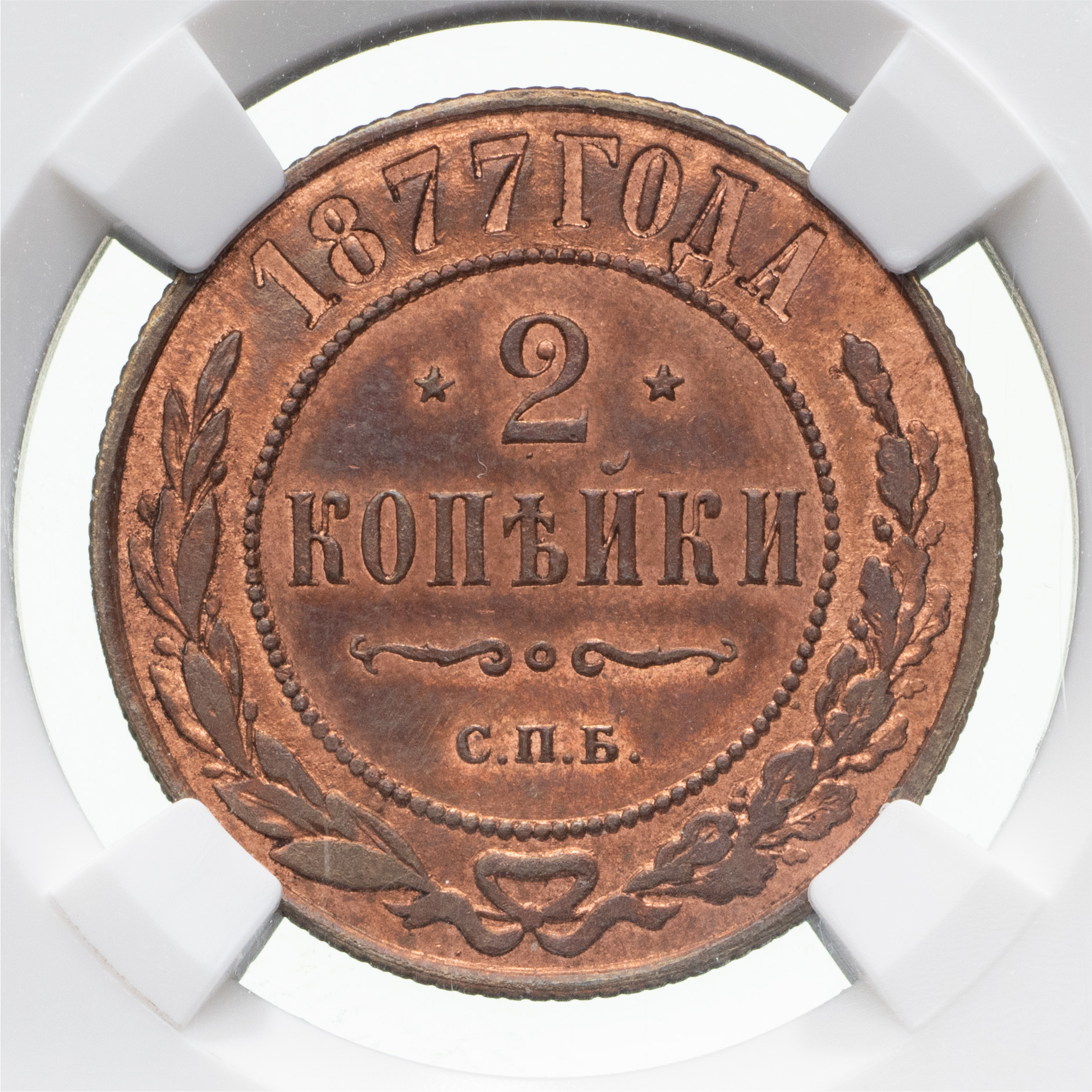 2 копейки 1877 года, СПБ. Медь. Монета в пластиковой капсуле (слабе) ННР, PF 64 RB. ГМ# 23.21. Brekke# 165. Уздеников# 3773. Биткин# 527.