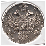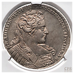 1 рубль 1731 года. Лиц. ст.: портрет с большой головой и брошью на груди. Об. ст.: крест державы узорчатый. Серебро. Монета в пластиковой капсуле (слабе) CPRC, MS 61. ГМ# нет. Severin# 1063. Уздеников# 0700. Дьяков# 8. Биткин# 39 (R). Полуйко# 31.5, 031. 2 рубля 75 копеек по Петрову.