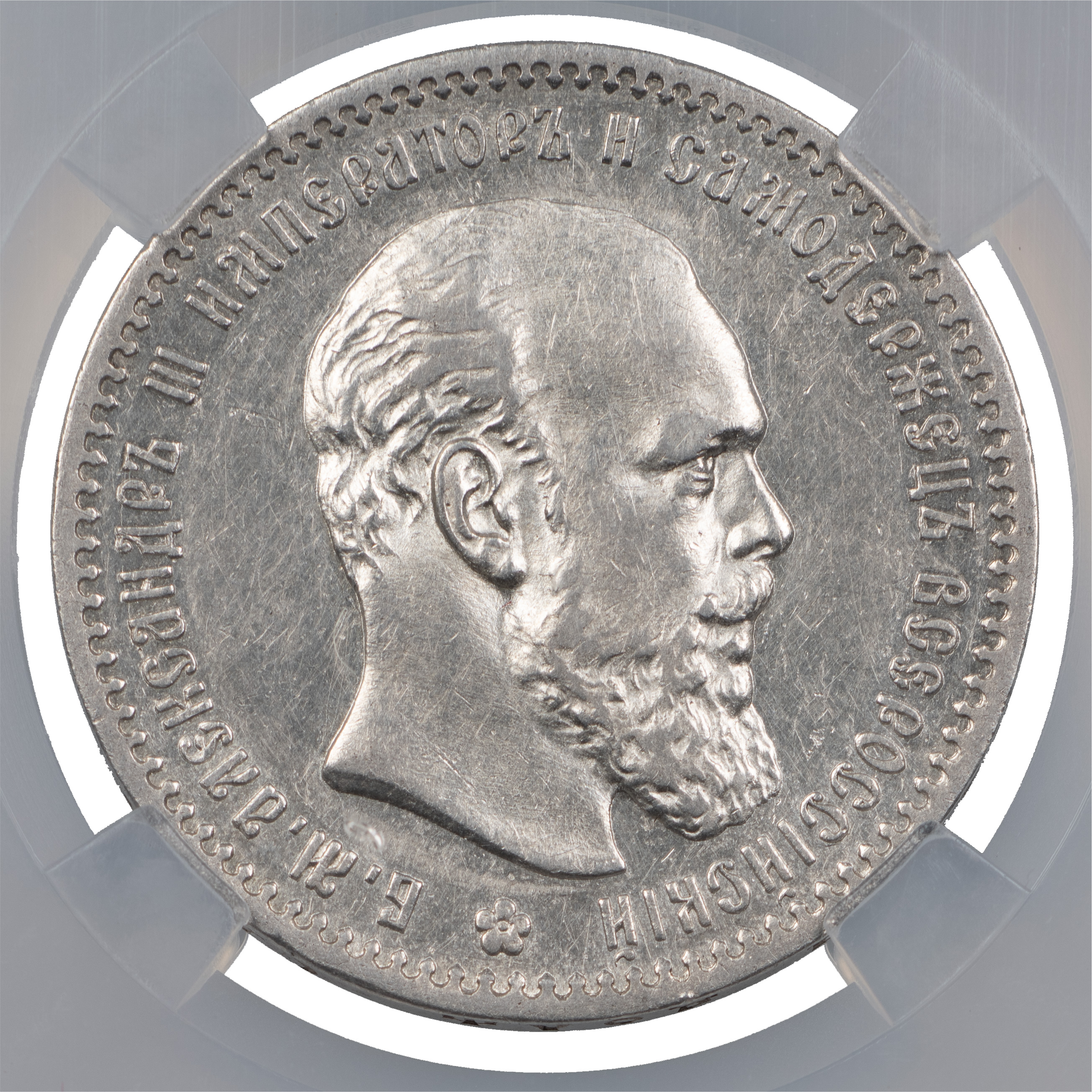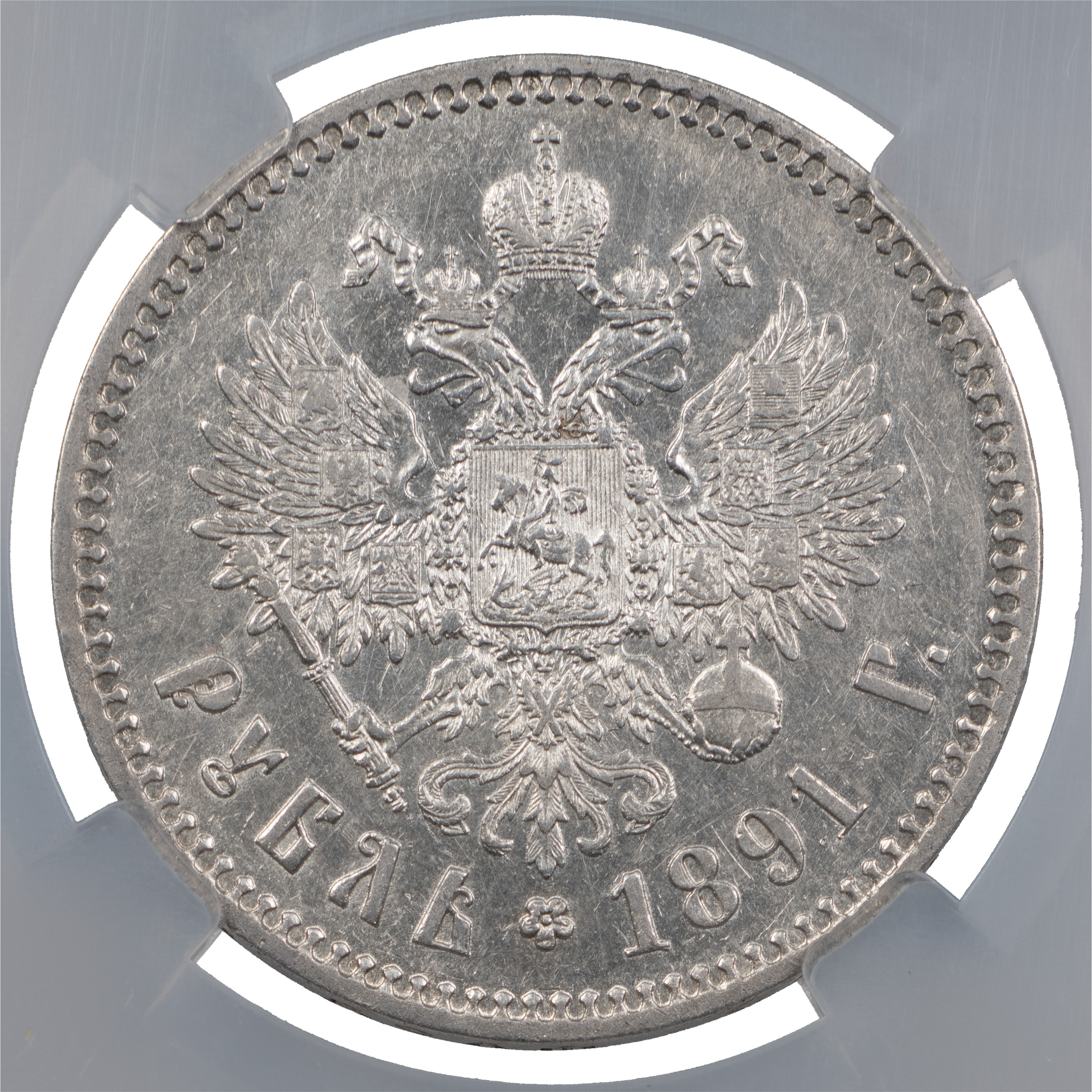 1 рубль 1891 года, АГ-АГ. Об. ст.: цифры даты сближены. Серебро. Монета в пластиковой капсуле (слабе) ННР, AU det, коллекция Казакова В. В. ГМ# 7.3. Severin# 4005 (точка). Уздеников# 2040. Биткин# 74. Казаков# 741*.