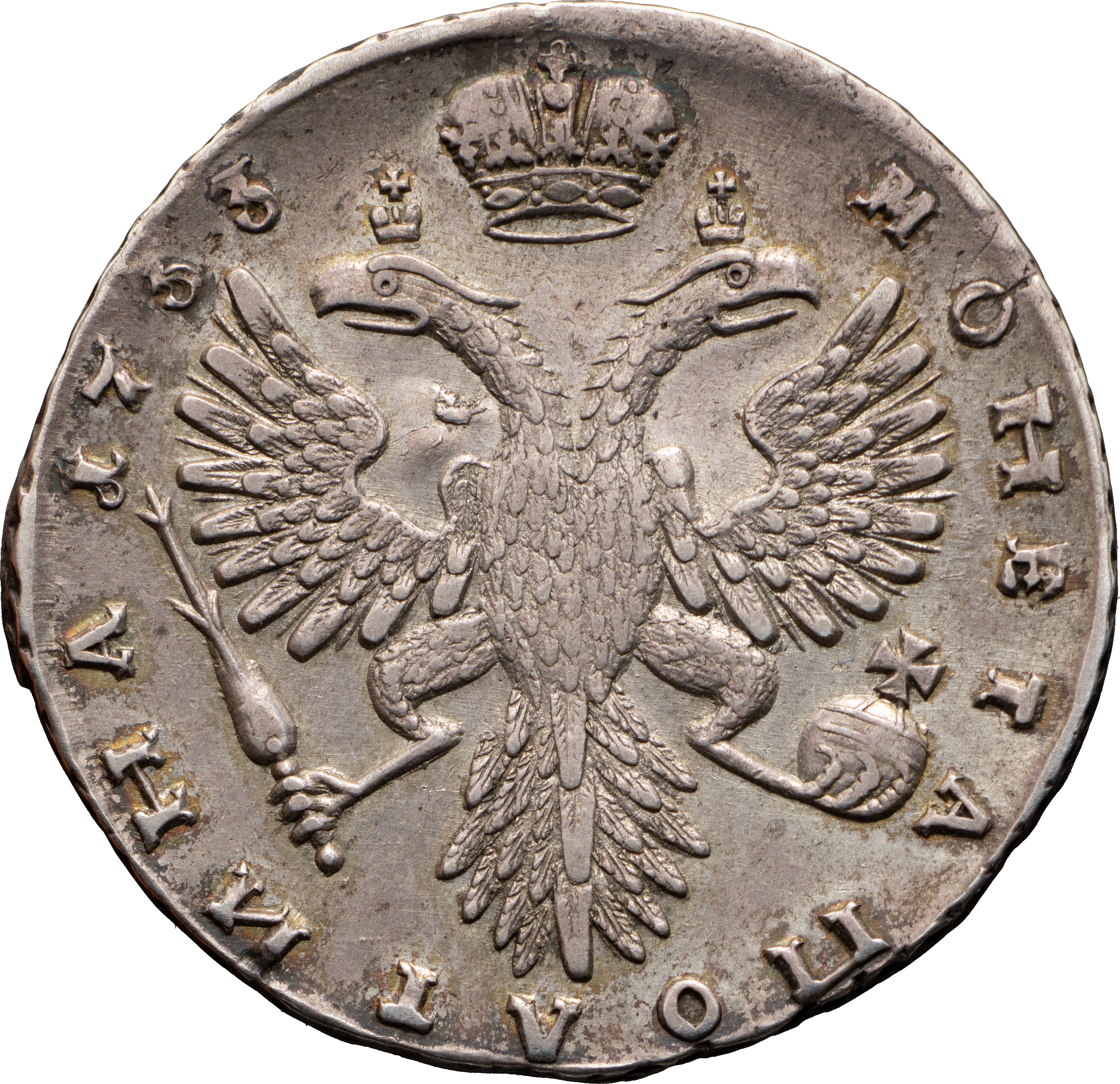Полтина 1733 года. Лиц. ст.: портрет с большой головой. Об. ст.: крест державы простой. Серебро, 12,37 г. Сохранность почти отличная, приятная старая патина. ГМ# 6.10, вар. Severin# 1109 (точка). Уздеников# 0708. Дьяков# 4, вар. Биткин# 148, вар. Довольно редкая, 3 рубля по Петрову.