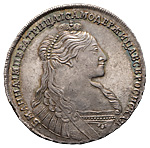 1 рубль 1735 года. Лиц. ст.: портрет с кулоном из трёх жемчужин на груди, девять жемчужин в волосах. Серебро, 25,63 г. Сохранность отличная, густая патина, небольшая реставрация фрагментов рельефа. ГМ# нет. Severin# 1209. Уздеников# 0723. Дьяков# 7, вар. Биткин# 122, вар. Полуйко# 35.5, 366, вар. 2 рубля по Петрову.