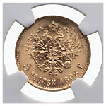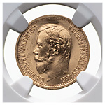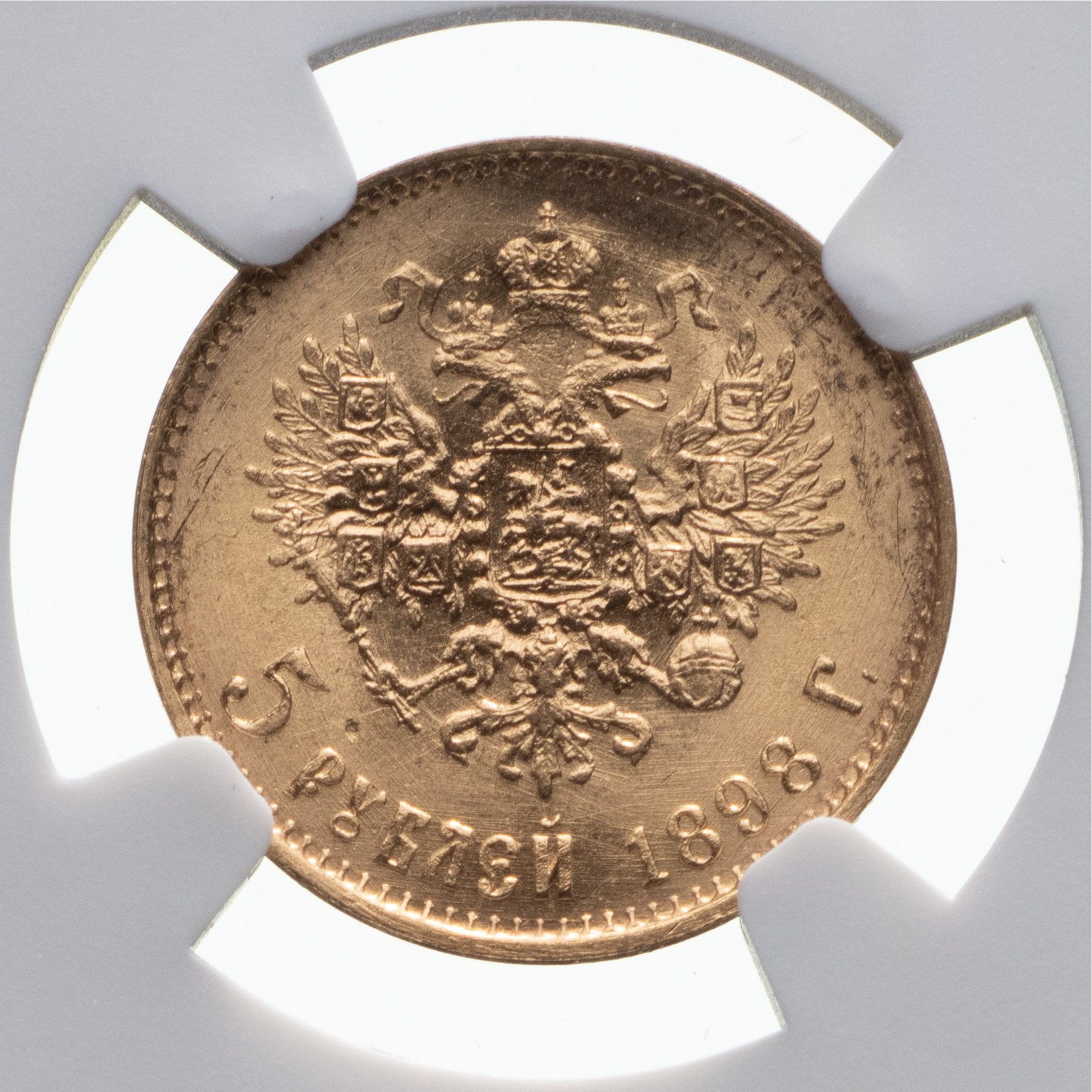 5 рублей 1898 года, АГ. «Советский чекан». Лиц. ст.: голова больше, выступающий кант шире, детали причёски рельефные. Золото. Монета в пластиковой капсуле (слабе) NGC, MS 66. Severin# 563. Уздеников# 0328. Биткин# 20. Казаков# 108. ФедоринVI, Приложение, С. 493, # 2.